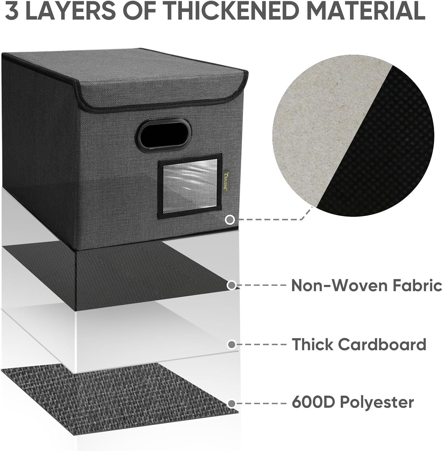 - [DURABLE MATERIAL] The outer layer of our filing box is crafted from high-quality polyester fabric and reinforced with thick cardboard in the middle. This construction ensures that the box maintains its shape and provides better bearing capacity for important documents and files. Its textured appearance can also serve as a stylish decorative element in any office or home.