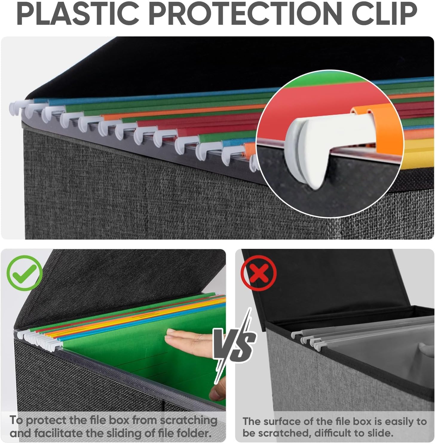 - [UNIVERSAL SIZE] Our file box with lid fits letter-sized files. It is designed for efficiency and functionality, with its smooth PVC slide rails on both sides, you can effortlessly slide file folders for easy access and neatly arranged. The lid fits snugly on the box after hanging folders. (NOTE: file folders are not included)