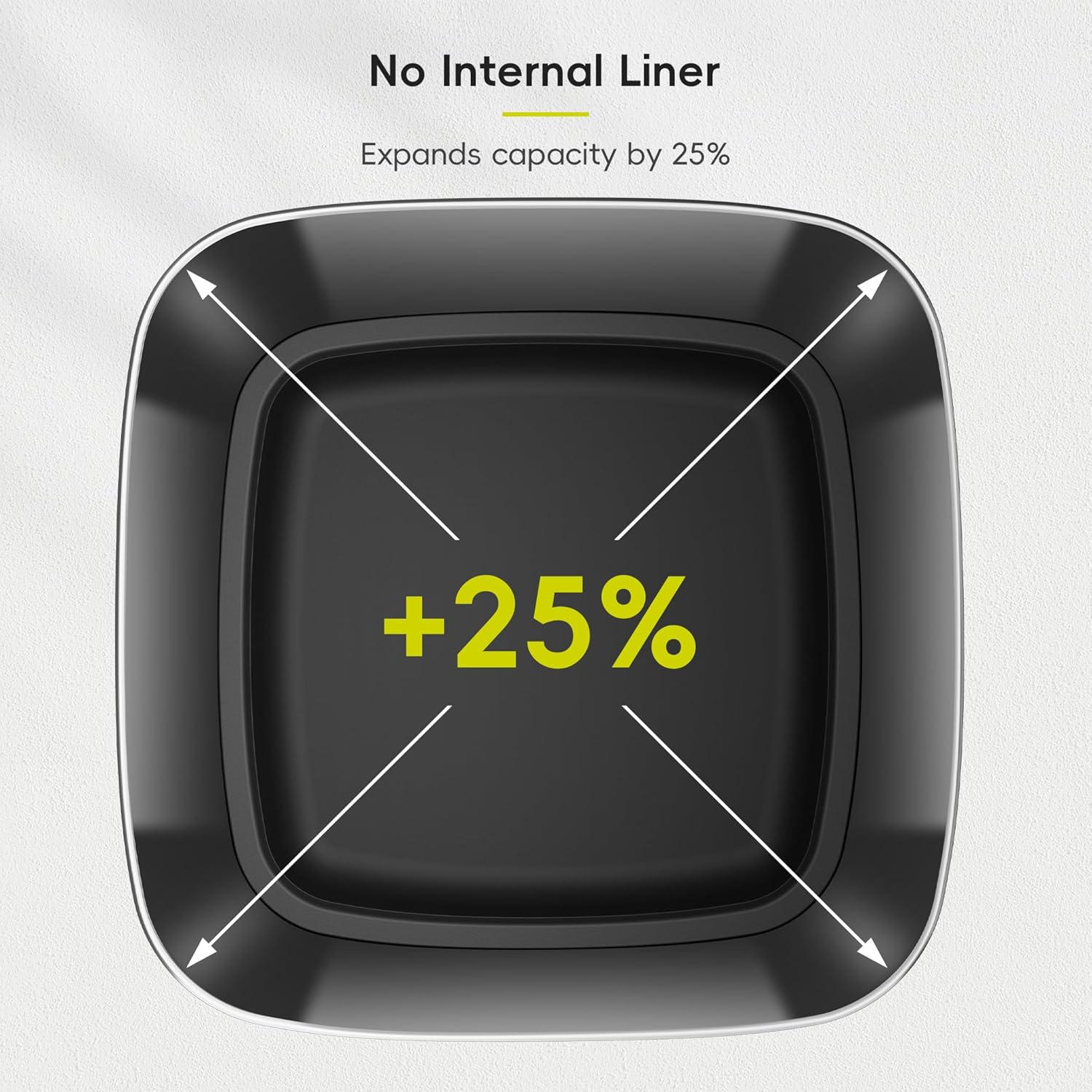 - 25% MORE CAPACITY - No liner design maximizes capacity by offering 25% more room to dispose of the trash compared to a standard 21 Gallon.