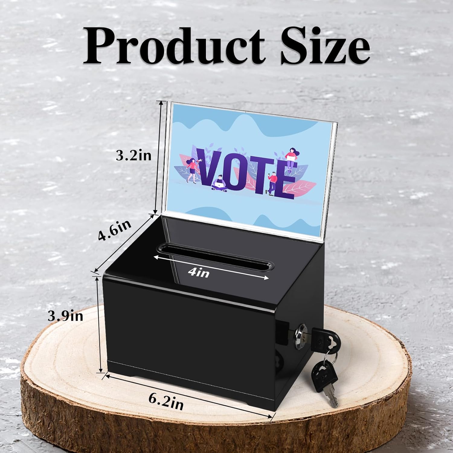 - 【Package Include】You will receive 1 pack acrylic donation boxes with 1 pack Detachable Sign Holder, suggestion box measure 6.2x4.6x3.9inch, The removable sign holder on the top of the ballot box has dimensions of 6.2x4inch,enough to meet your daily needs.Tips: To prevent the key from scratching the surface of the plastic lottery box, we put the key inside the box. When you receive the product, open the box first to get the key.
