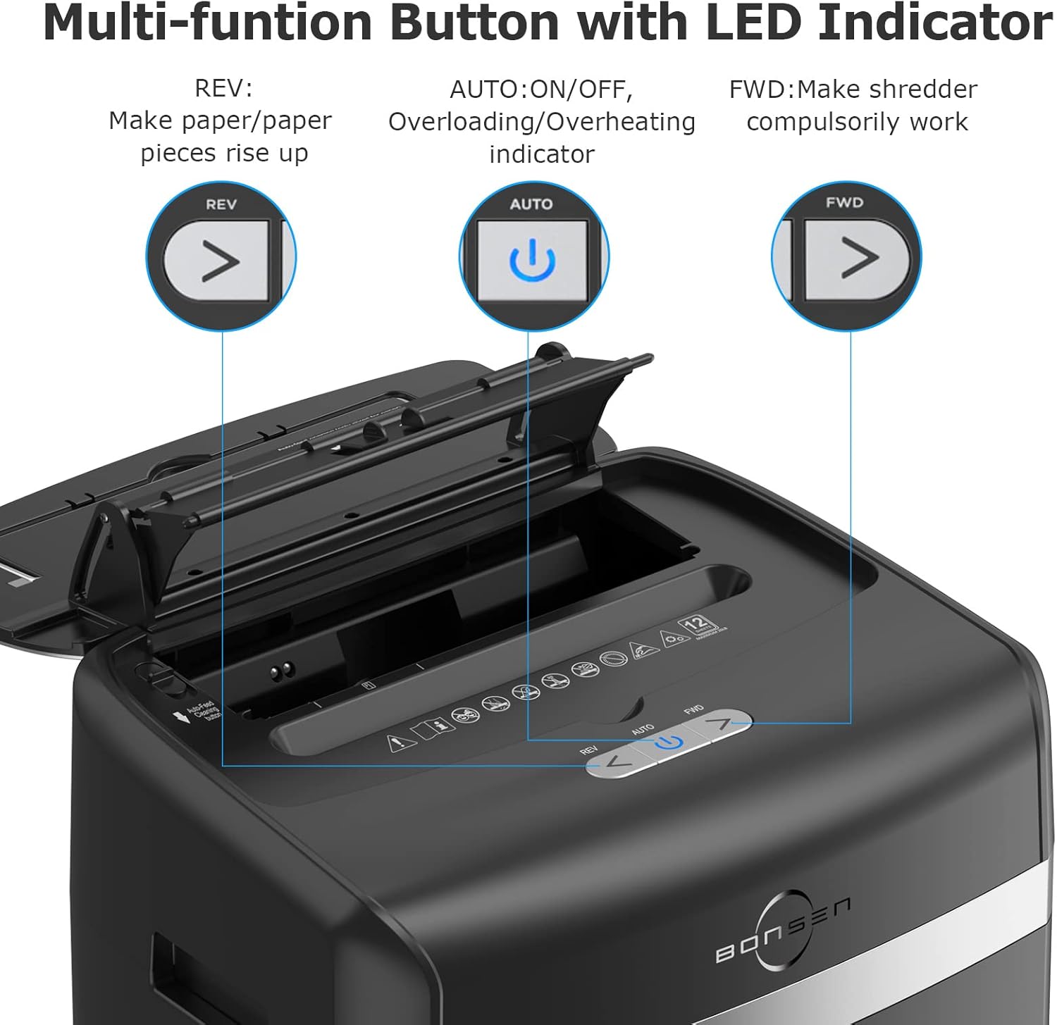- Two Different Shredding Mode: Bonsen paper shredder is designed with Auto & Manual modes. 120 sheets automatic shredding (only for paper) and 12 sheets manual shredding capacity (shreds paper, clips, staples and credit card)