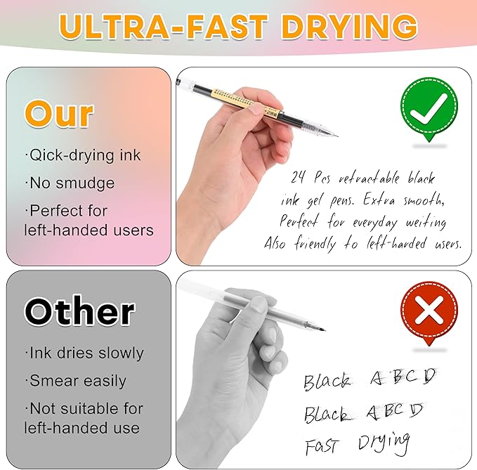 - Durable & Comfortable:Featuring a durable clip, these gel roller pens attach securely to notebooks/pockets. The ergonomic grip ensures comfortable long term writing. Perfect for extensive note takers and on the go artists.