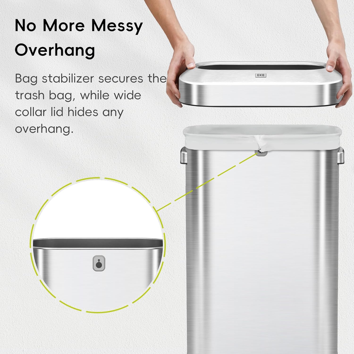 - [No More Messy Overhangs] The built-in plastic bag fixer keeps your trash bag securely in place, while the wide lid hides bags from sight, providing a cleaner, more organized visual appeal for your trash bin.