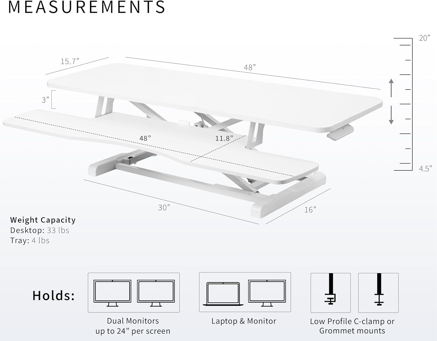 - Spacious 48β Surface: The large top surface measures 47.6β x 15.7β, providing plenty of room for dual monitor and laptop setups. The 47.6β x 11.8β (10.2β in center) keyboard tray raises in sync with the top surface to create a comfortable workstation