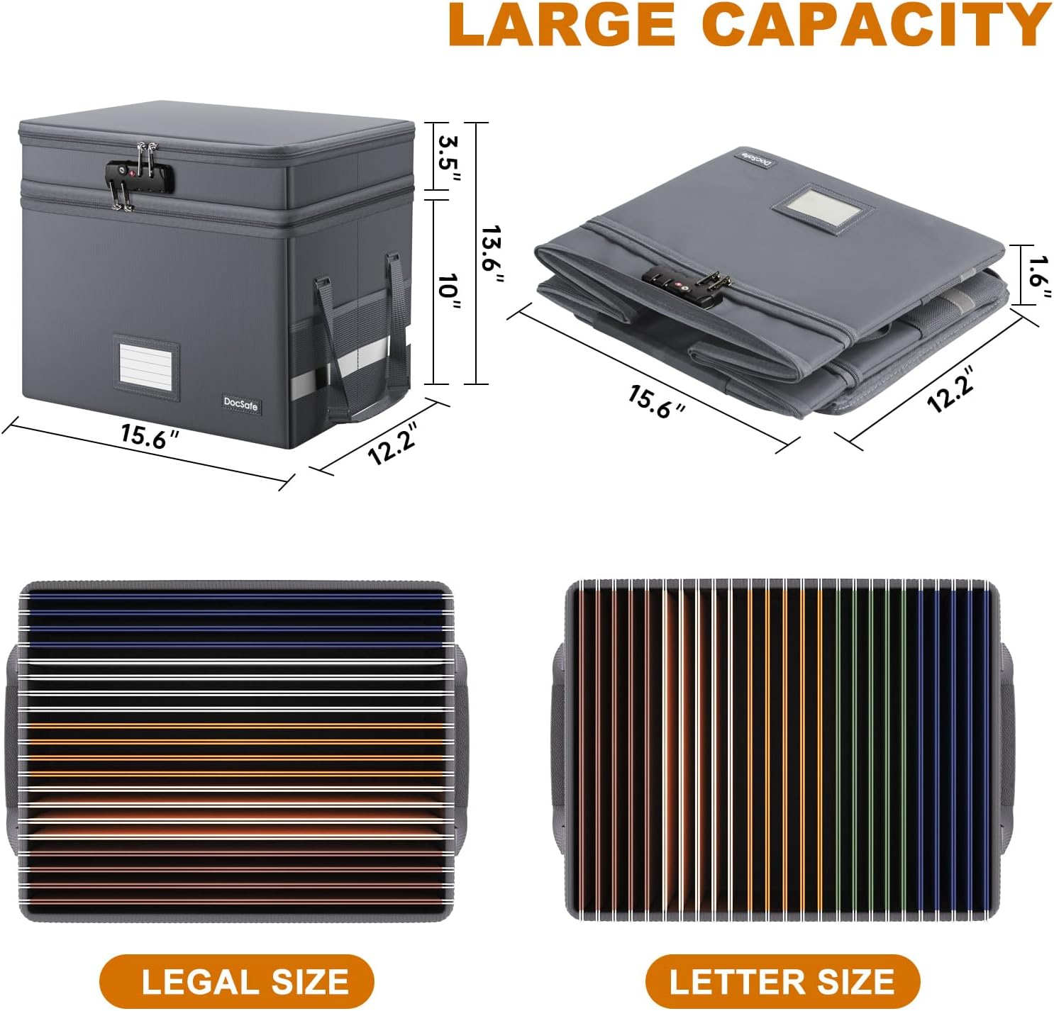 - Multi-LayerοΌLarge-capacity(16"x13.8"x12.2"): Compared with other file boxes, our fireproof file box adopts a multi-layer design that can meet all your storage needs. These include 8 passport mesh bags, 16 card slots, 4 U disk pockets, 2 mesh bags, 4 outer pockets, 1 large pocket, and one main pocket with large space. They are ideal for storing cards, passports, CDs, USB, albums,certificates and other valuables.The main pocket can fit both letter and legal-size files or anything else you want.