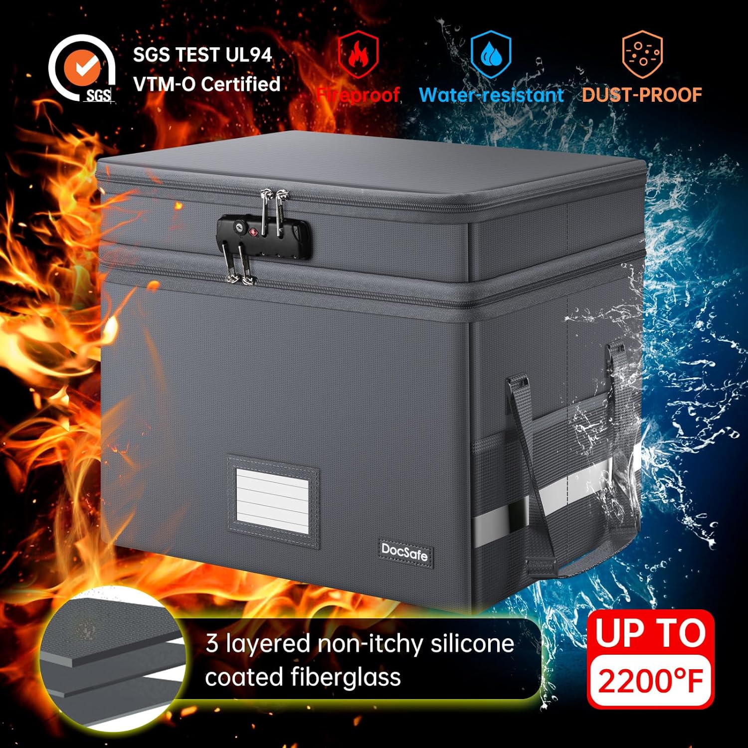 - Fireproof and Water-resistant: The multi-Layer rolling fireproof file box is made of 3 layered non-itchy silicone coated fiberglass which stands up the temperature up to 2200β.It has been passed by SGS TEST(UL94 VTM-0 Certified).The file lock box is fireproof and waterproof, which can effectively protect your important documents in a fire, flood, and wet weather. They will further keep your files intact. Nothing is completely foolproof, but added protection is always a good idea.
