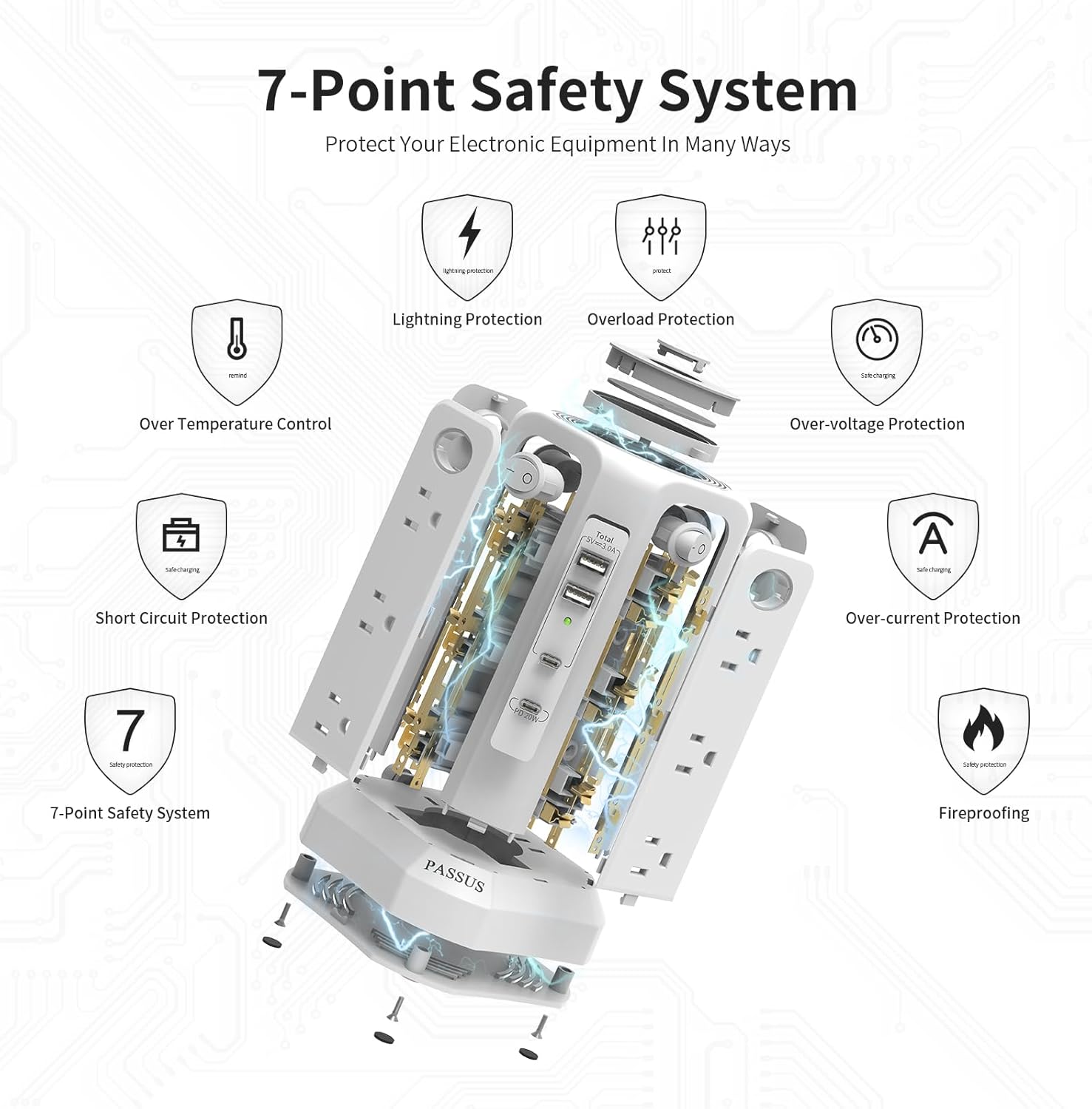 - Smart Power Strip with Night Light: PASSUS power strip tower with night light mode features three brightness levels. The soft and comfortable light is just enough to light the surrounding area, enhancing safety at night. You can manually turn on/off the night light to meet your needs.