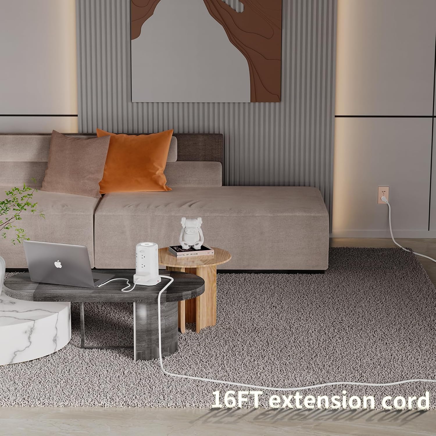 - 16 Feet Extra Long Extension Cord: This multiple outlets charging tower power strip has a 45Β° flat plug and 16 ft long cord. The long extension cord cable is flexible enough that can fit easily into hard-to-reach places behind your bed or sofa in a long distance.