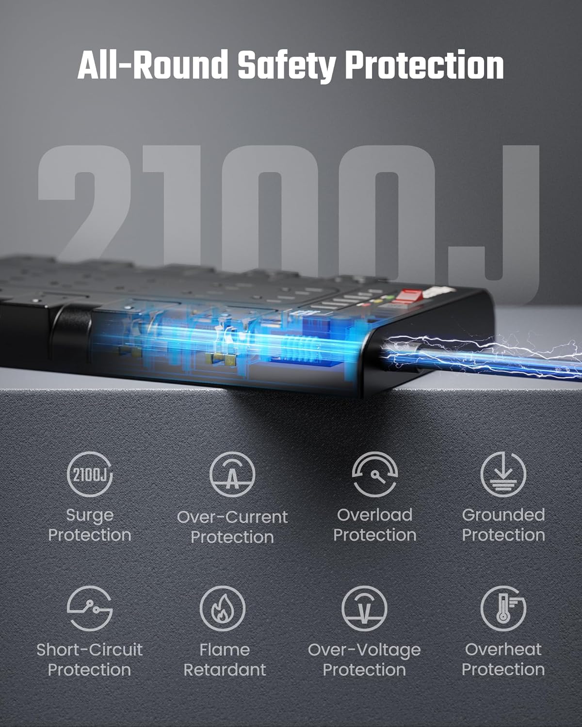 - 【Superior Safety Charging Station】The power strip with USB C ports is inbuilt with 2100 joules of surge protection—protect your devices from power surges caused by lightning strikes or faulty electrical wiring. With a 1380℉ flame-retardant casing and multiple safety features against overload, short-circuit, over-current, over-voltage, overheat, and ground fault, our power strip keeps your connected device safe. FCC, RoHS certified, together with UL-Recognized extension cord and 45°flat plug.