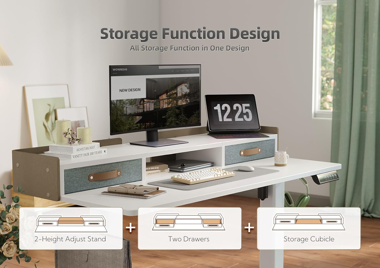 - 2-Drawers for Storage - Adjustable stand desk with drawers. 2 tabletop drawers provide more storage & organize space for a variety of home office tasks. The desk comes with a hook, drawers, and felt fence, which provides more home office desk usage possibilities.