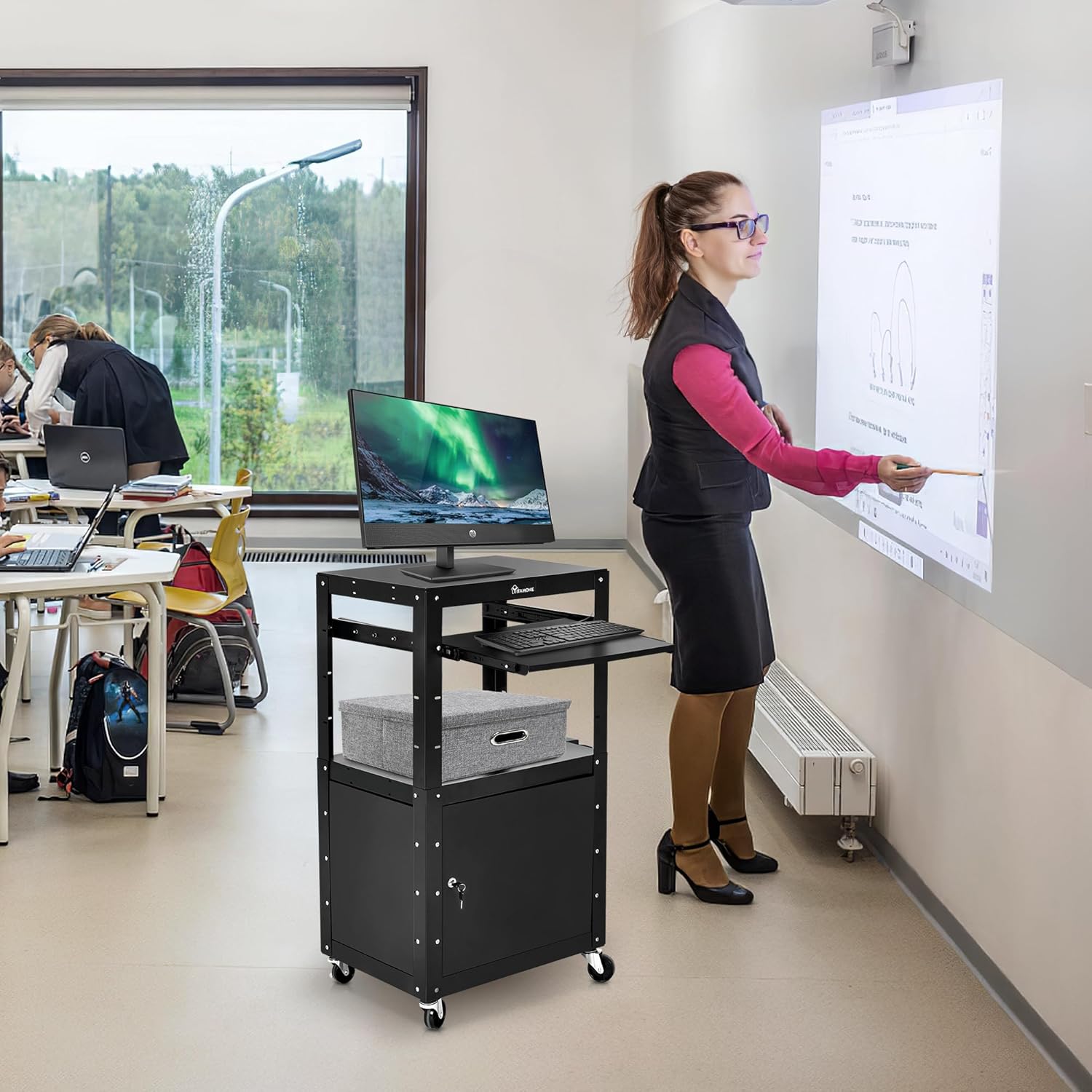 - Secure locking cabinet: the featured locking cabinet provides extra security to ensure the safety of media devices such as laptops, iPads, tablets, etc.