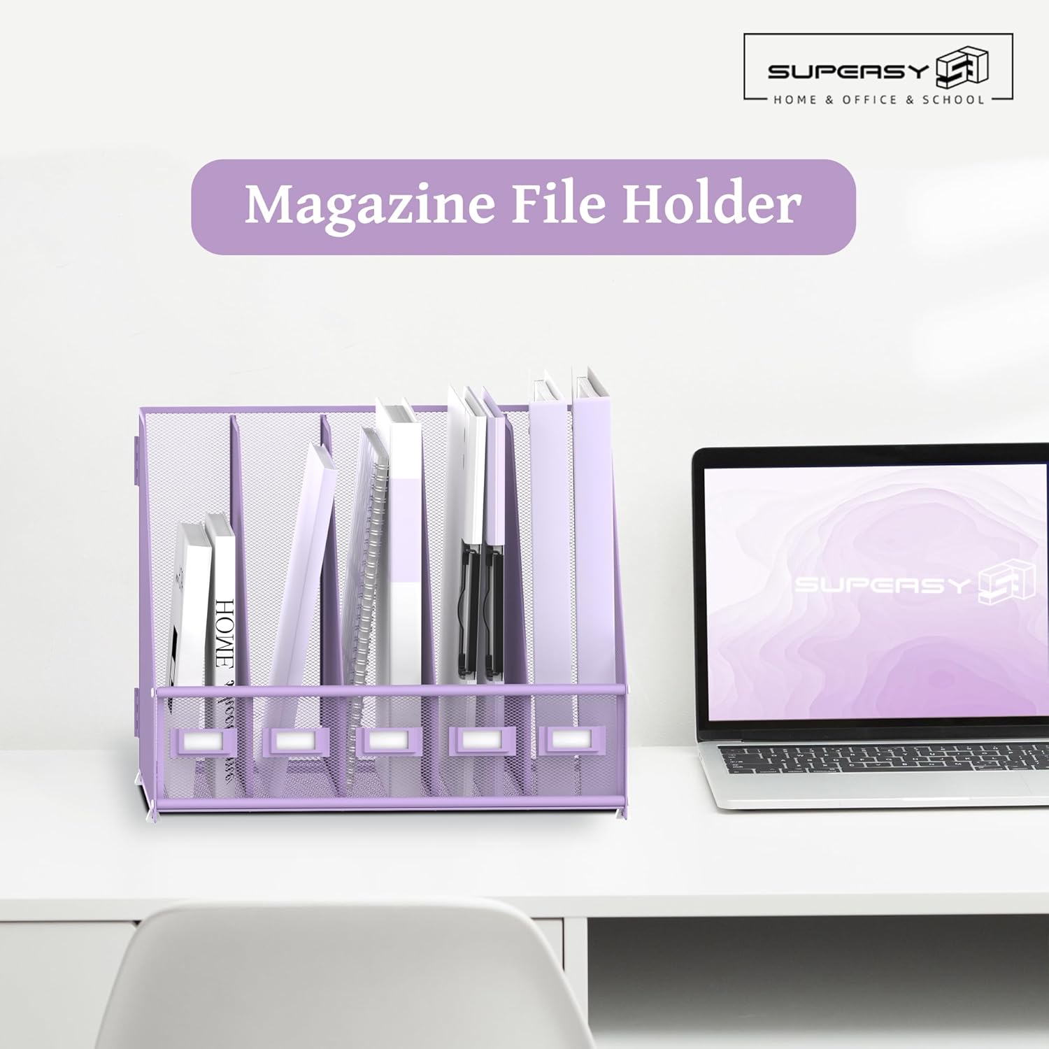 SUPEASY Desk Organizers Metal Desk Magazine File Holder with 5 Vertical Compartments Rack File Organizer for Office Desktop, Home Workspace, Purple
