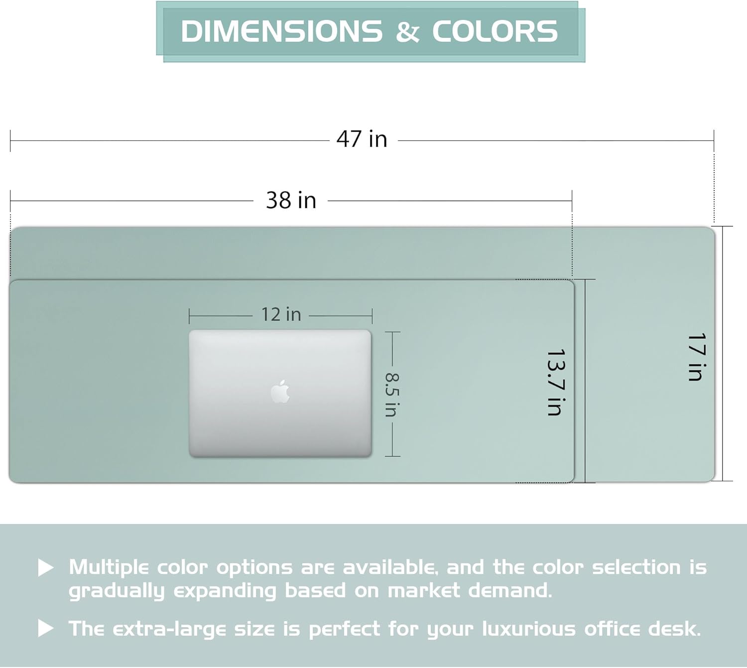 - Multifunctional Desk MatοΌDiscover the versatility of our Multifunctional Desk Pad! Measuring 38" x 13.8" / 47" x 17", it provides ample space for your laptop, mouse, and keyboard. Enjoy its comfortable and smooth surface, perfect for both mouse and writing activities. The non-slip material ensures stability during everyday use, enhancing your overall work experience.