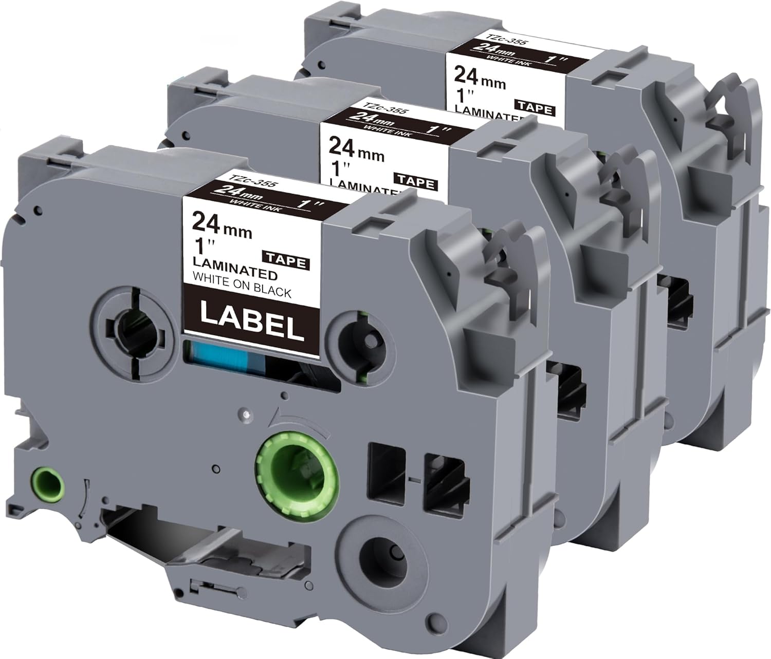 Weemay 3 Pack TZe355 24mm White on Black Laminated Label Tape Compatible with Brother Label Maker Tape TZe-355 TZe 355 TZ-355 TZ355 for PTouch PT-E500 PT-D600 PT-P750W PT-P900W Printer, 1 In x 26.2 ft
