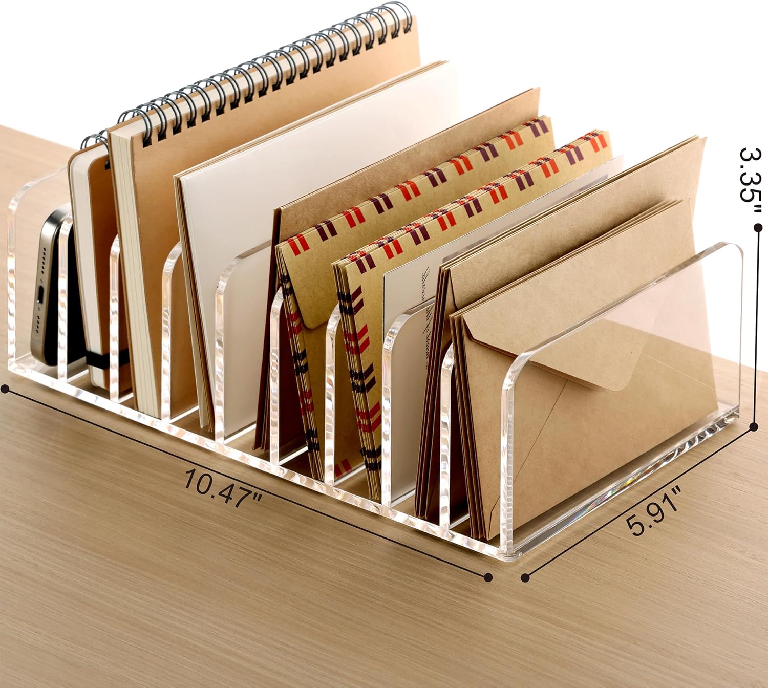 - 🗂️Small Size Large Capacity Letter Holder: Measuring 10.27" W x 5.9" D x 3.42" H ,our acrylic mail sorter features 9 spacious storage compartments, providing ample storage and sorting space for your mail and paper. It is the perfect desktop organiser for organising files, magazines, documents, letters, books, binders, folders, mail, eye shadow trays and more.