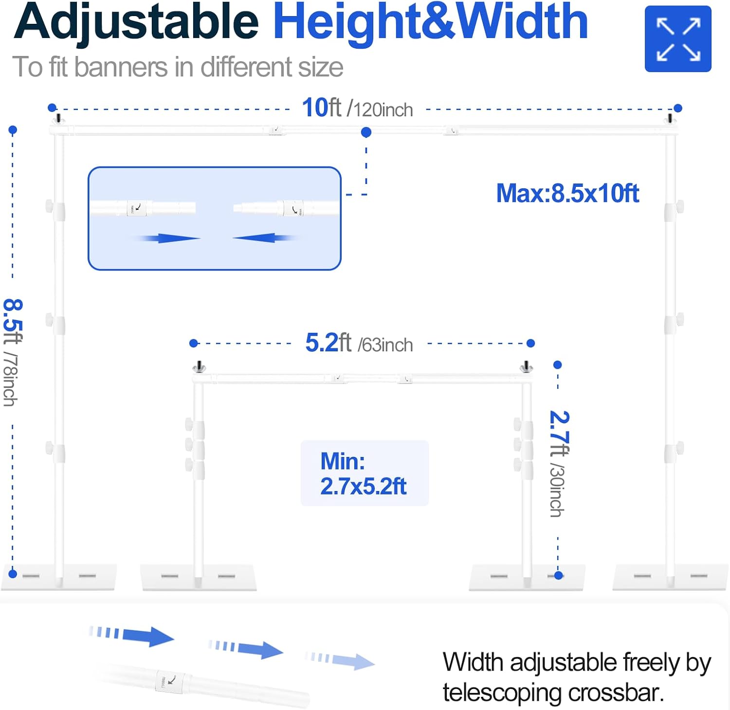 EMART Backdrop Stand, 8.5x10ft Width Adjustable Photography Background Support Poles with Heavy Duty Flat Base, Photo Metal Steel Pipe and Drape Frame Kit for Parties Birthday Wedding - White