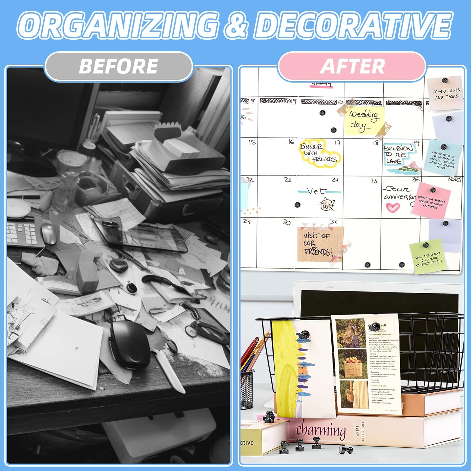 - Versatile Use: These small strong magnets are perfect for keeping your kitchen, office, or classroom organized. Use these magnetic push pins on magnetic surfaces like whiteboards, refrigerators, lockers, and bulletin boards to display notes, photos, calendars, greeting cards, recipes, schedules, artwork, or memos. Theyβre also ideal for practical uses like hanging jewelry, keys, utensils, or small tools, making them a must-have for both creative and functional spaces.