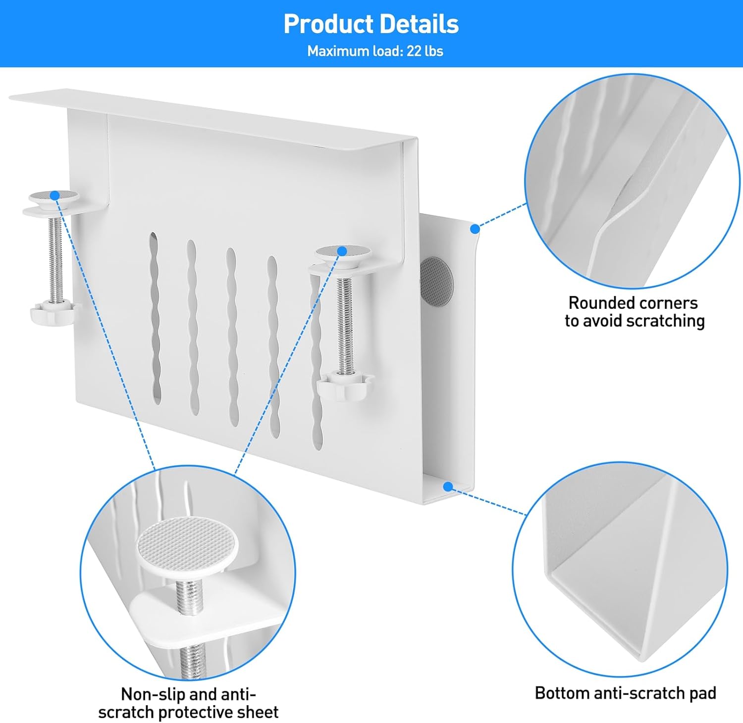 - γNon-Slip & Anti-Scratch SheetsγOn the inner surface and the bottom of our laptop tray and both ends of the clamp feature non-slip sheets, which can help fix the laptop on the desk side storage without scratching the laptop, tablet or other device.