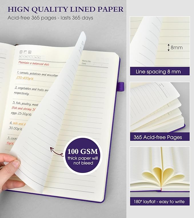 - 【365 Pages Premium Thick Paper】: Our PERCUN lined journal notebook is made of 365 pages high-quality 100Gsm thick ruled pager with an acid-free light Ivory paper that is thicker than normal. This premium quality paper will not cause bleeding, ghosting or smudging and is suitable for most types of pens,provides ample space for journaling, note-taking, and creative writing. The line spacing is 7mm, making it easy to write legibly and neatly.