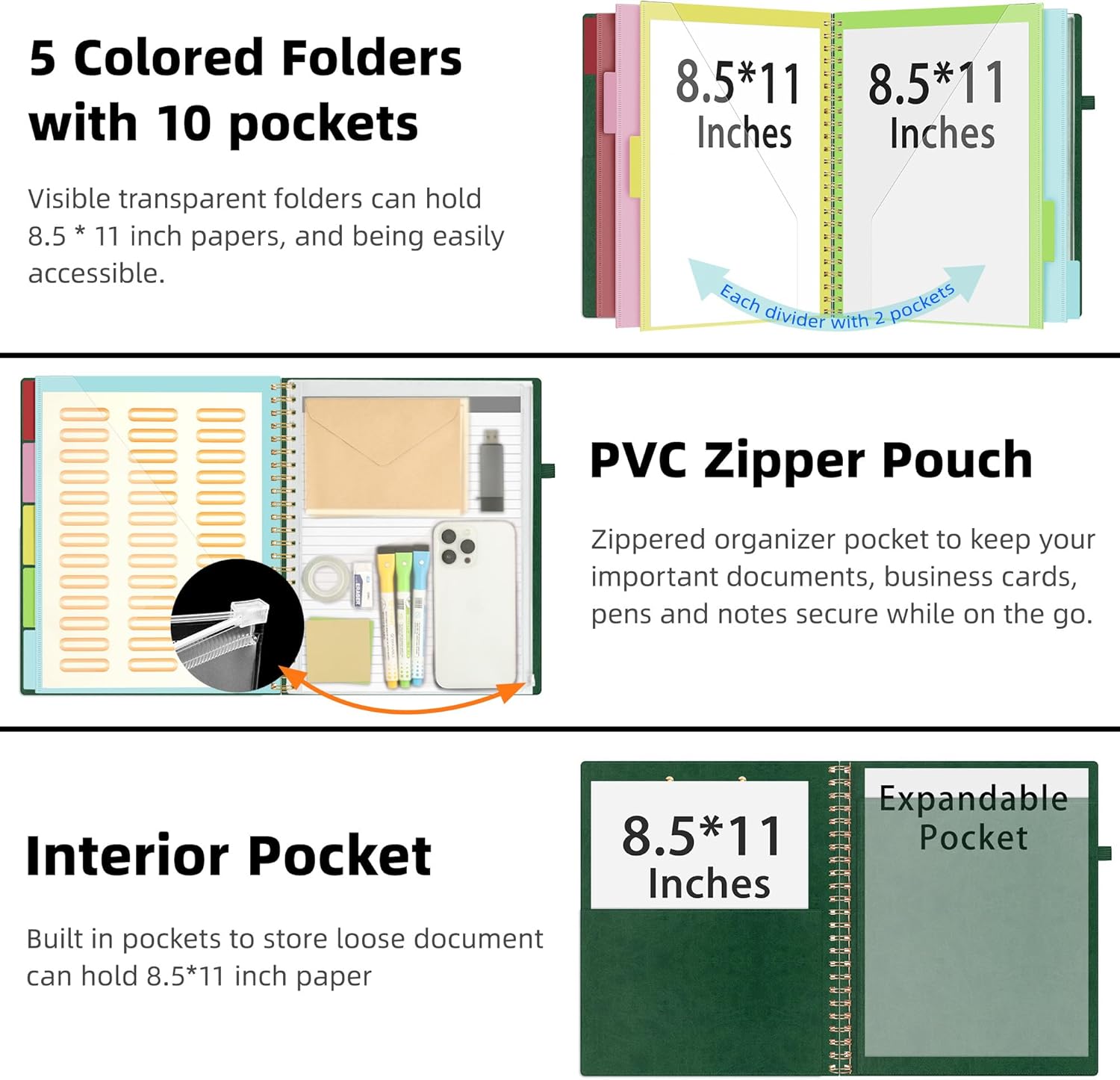 - 【Stay Organized】The portfolio organizer features a clear, zippered pouch for secure on-the-go storage of documents and notes, interior pocket to store letter size papers and important loose documents. Clipboard comes with 5 extra Plastic Colour Folders with 10 pockets fit in all standard US letter size sheets(11*8.5''), plus 39 file folder labels self adhesive stickers for organized use.
