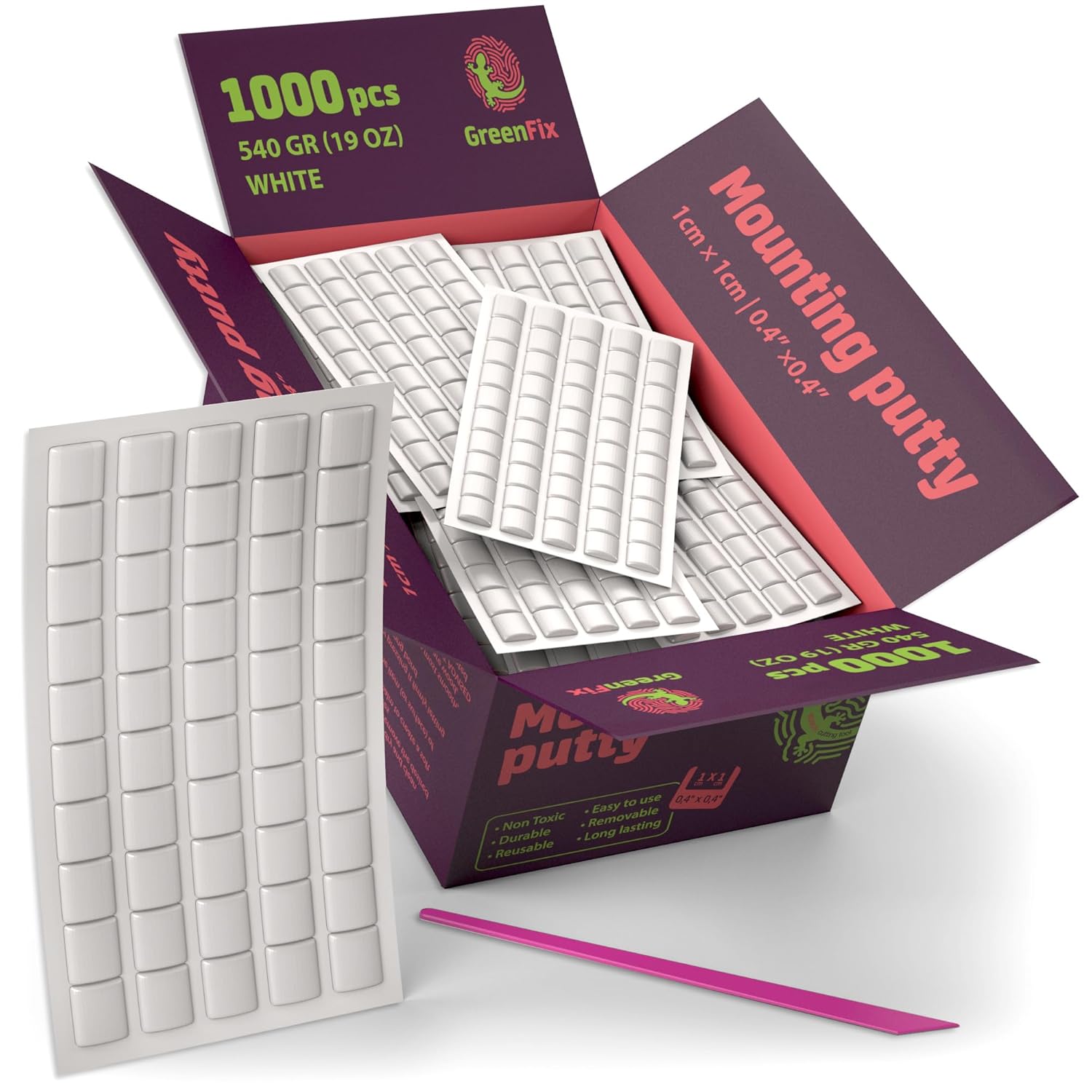 - ❇️ BIG BULK SET of mounting putty to last you a long time! Set includes 19oz (540g) of white adhesive putty and a special cutting tool. Sticky tack is pre-cut into 1000pcs mounting squares, 0.4” x 0.4” (1cm x 1cm) each.