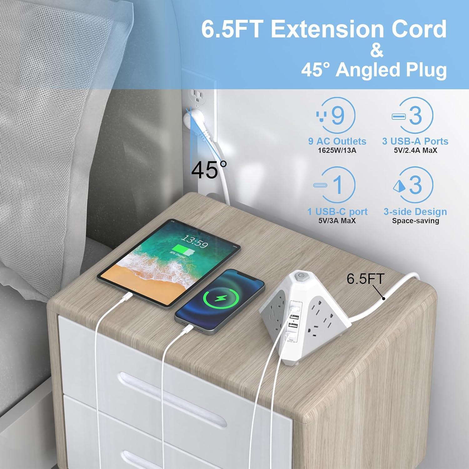 - Dimensional Triangle Design for Space Saving: 3-side compact design tower surge protector power strip takes up little space on your desk, cleans various cords, and makes your desktop organized; the desktop power strip bottom is equipped with 5 non-slip bases. 5 non-slip bearings improve the stability of the multi-tower and prevent it from moving during use.