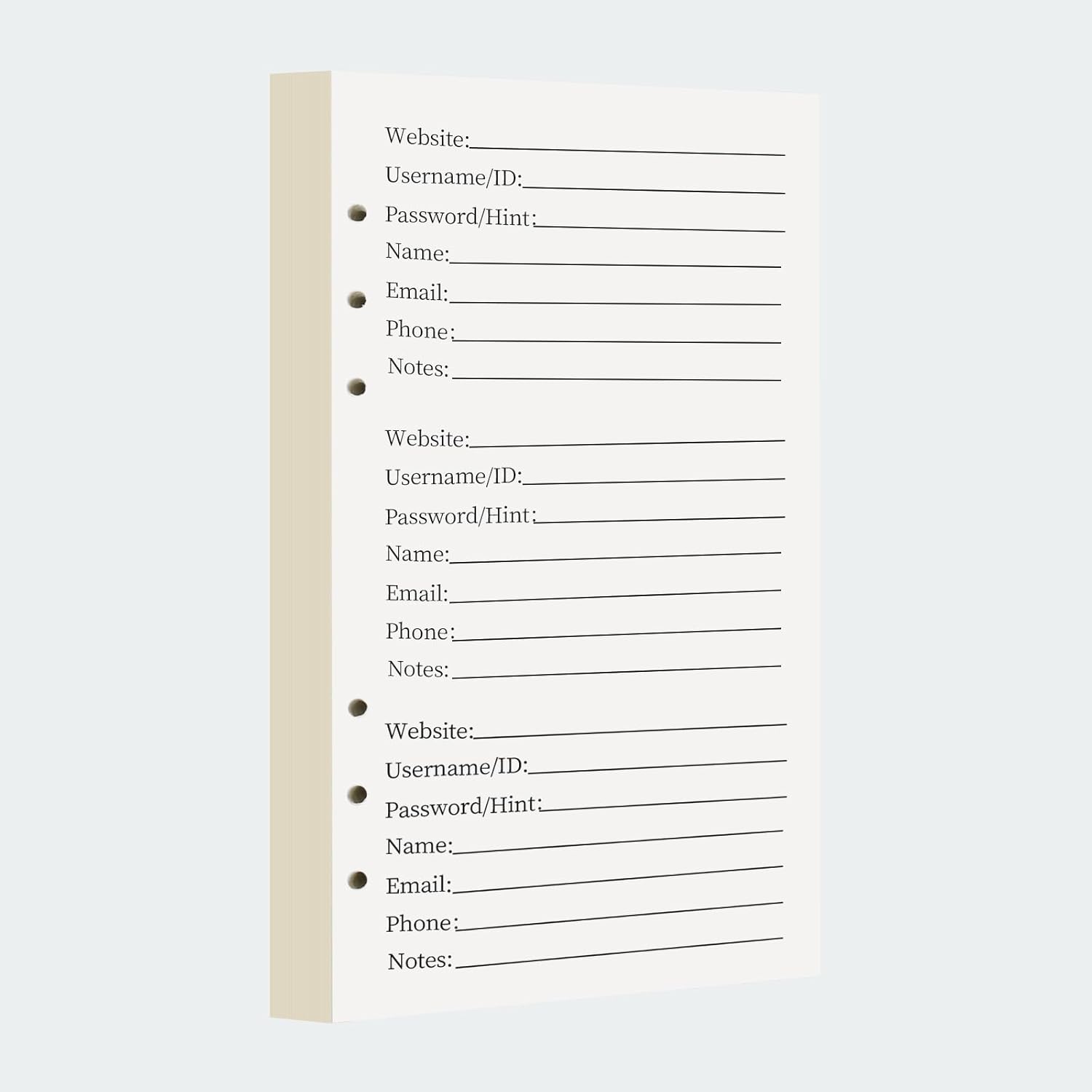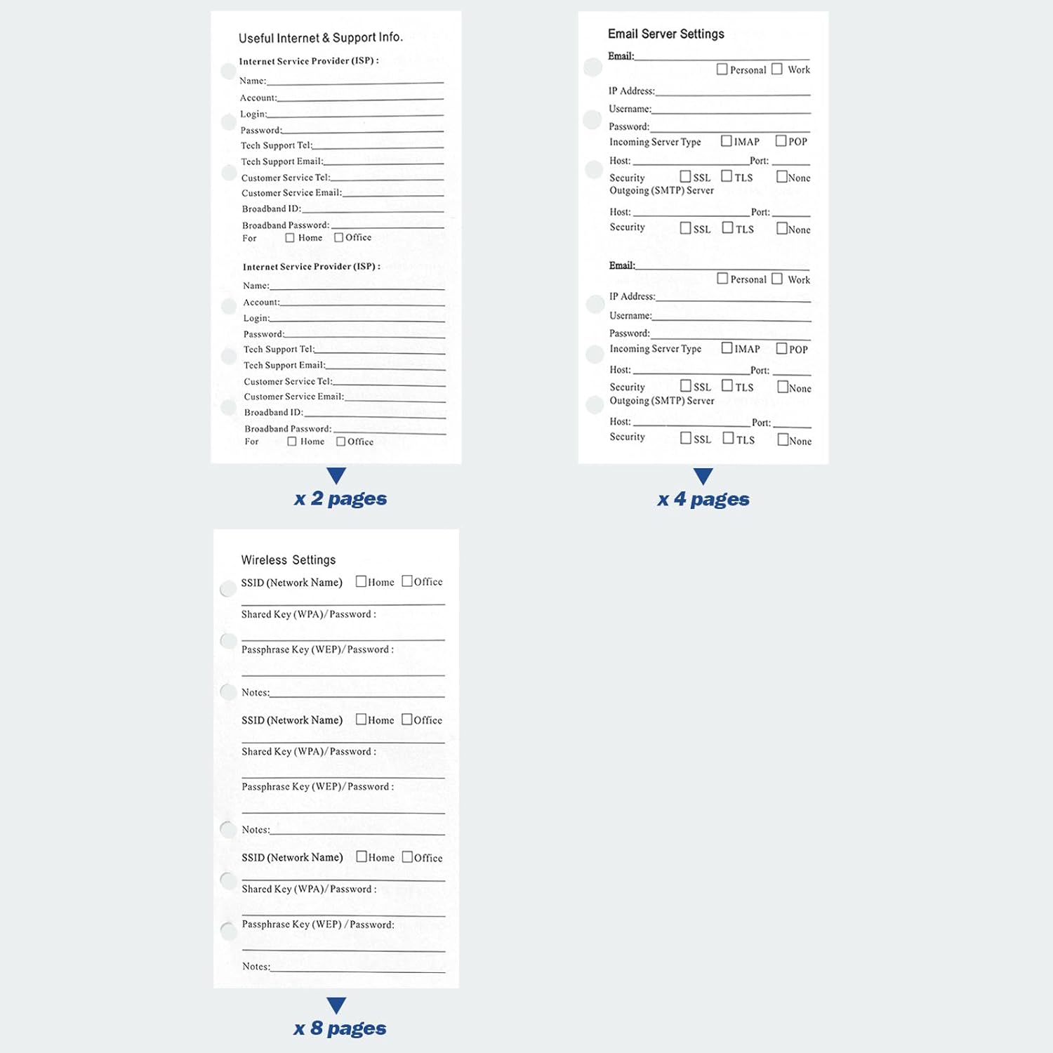 - Value Pack: Unlike other competitors' fewer pages, our A6 password book refills provide as many as 216 pages to bring you more value so you can use it for longer. Our set has 192 pages/ 96 sheets for password entries, 8 pages/4 sheets of lined pages, 4 pages for email settings, 4 for network settings, 2 for wireless settings, 1 for emergency contact, 1 for personal info, and 1 for PVC protect sheet.