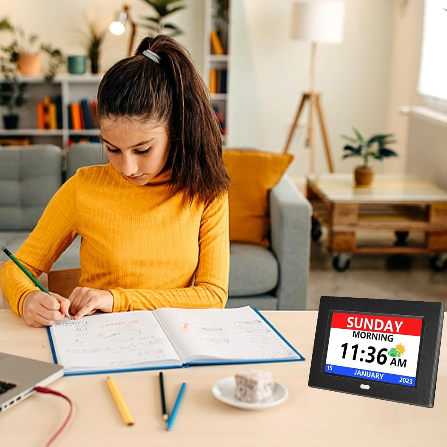 - Easy to Read:The digital clock for elderly has a 7-inch display that clearly displays the time,date,day of the week,four time periods of the day [morning,afternoon,evening,night],and displays the ICONS of each time period,non-abbreviated large font helps the elderly easily read the time.