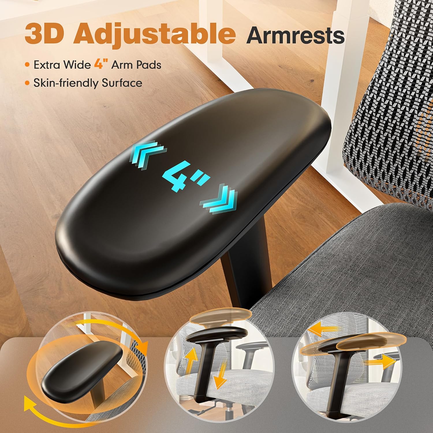 - γ4.5β" Wider Big Arm Padsγ3-D fully adjustable armrests raise up and down, pivot in and out, and shift forward and back, to provide steady support for your arms so your shoulders can remain in a relaxed position.