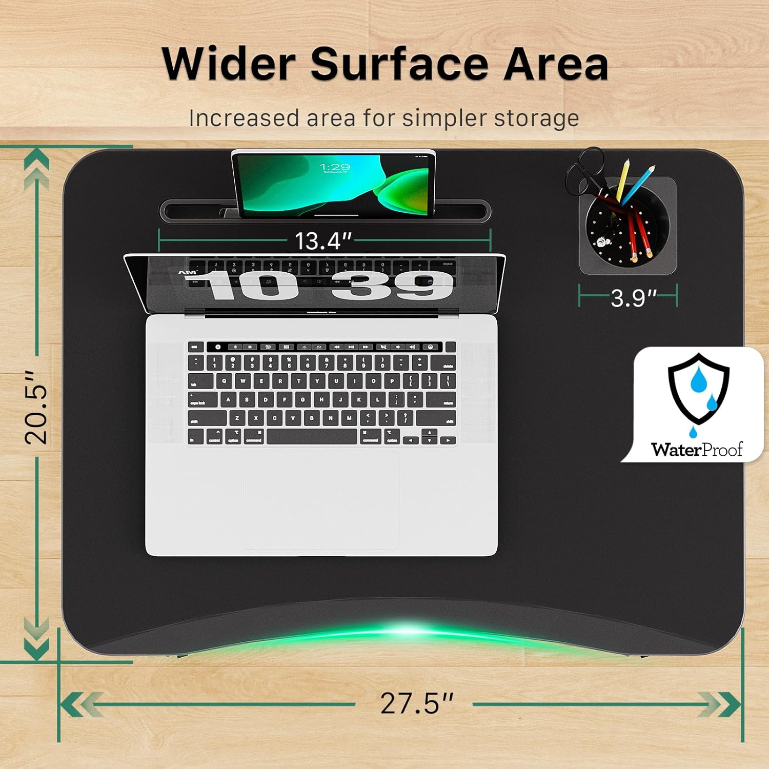 - Ergonomic Top DesignοΌCurved desktop of rolling laptop desk is for comfortable working conditions ,spacious desktop surface 27.5''L x 20.5''W mobile desk with cup holder and slot for better storage. And the table top is made of E0 grade ecological protection wood, which is resistant to dirt and not easy to scratch