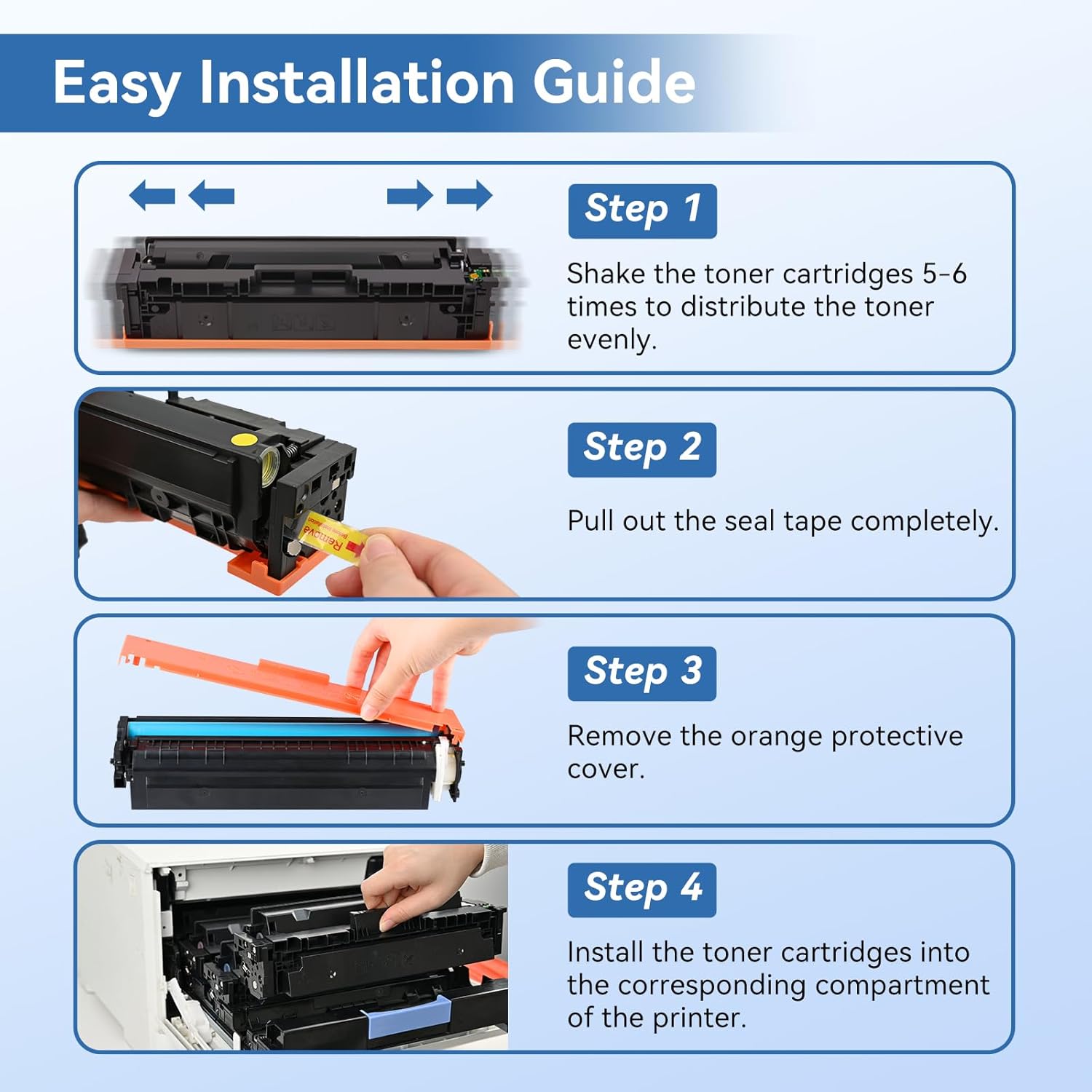 - Easy Installation: 206X 206A Toner Cartridges 4 Pack come with chips, which are designed for easy installation and better replacement compatible with M255, MFP M282 and MFP M283 series printers, eliminating the need to transfer chips from old cartridges