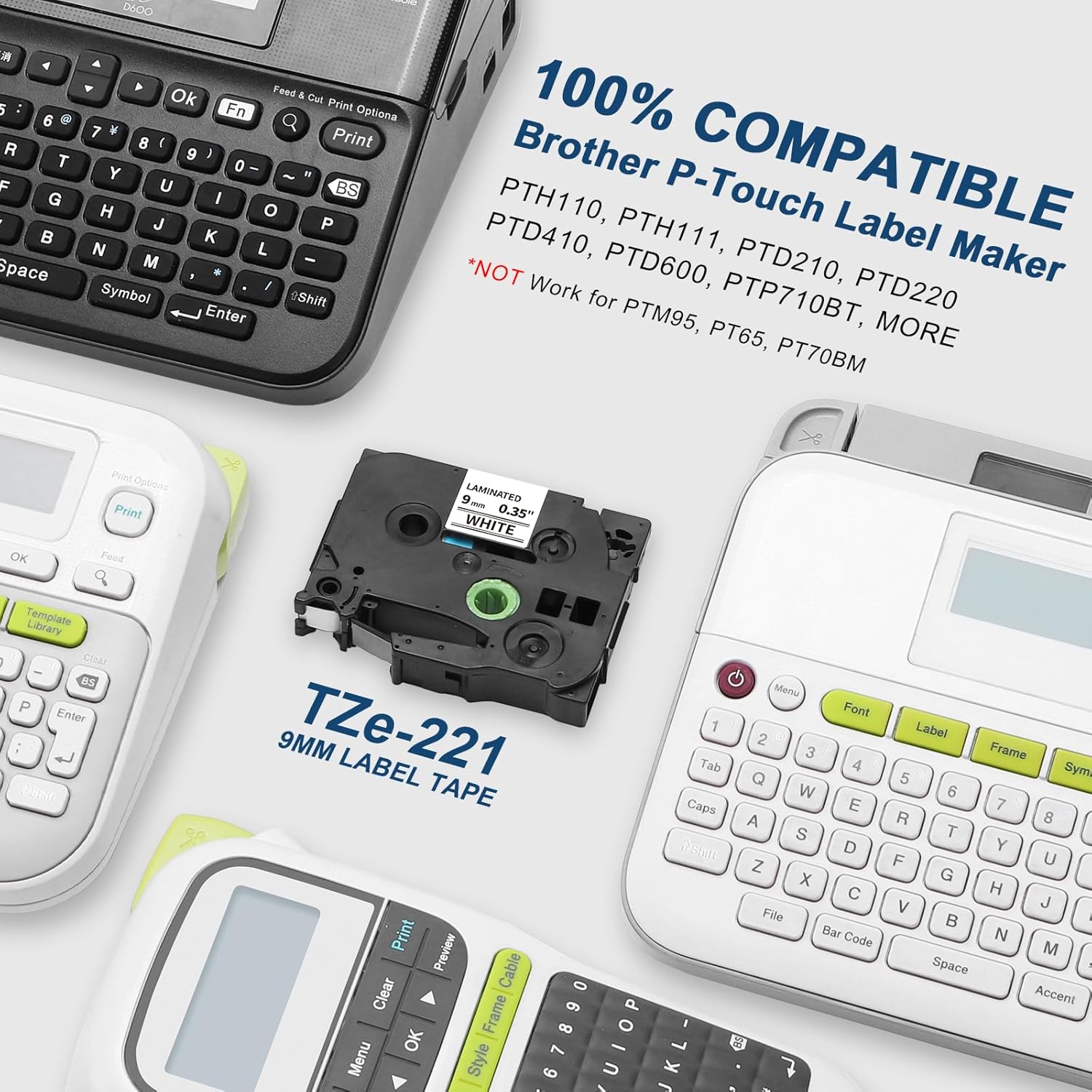 - Color: black on white, 6-pack 9mm p-touch label tape replacement for Brother TZE-221 TZE221 tz tape 9mm 0.35 laminated white. Size: 9mm x 8m (3/8 inch x 26.2 ft)