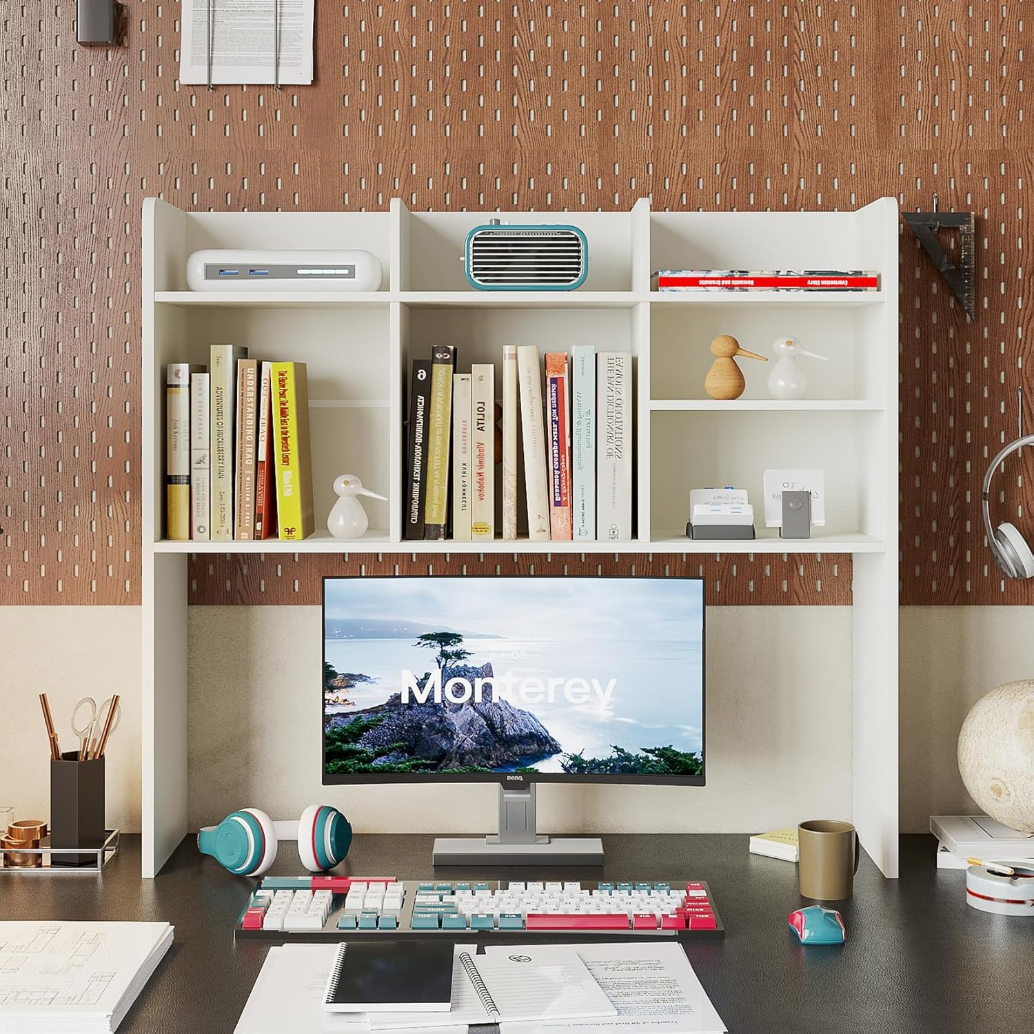 - γPartitioned StorageγDesktop shelf maximizes the use of space. It is designed with 7 storage compartments, including 5 small sizes and 2 large sizes so that your different items can be classified according to your needs