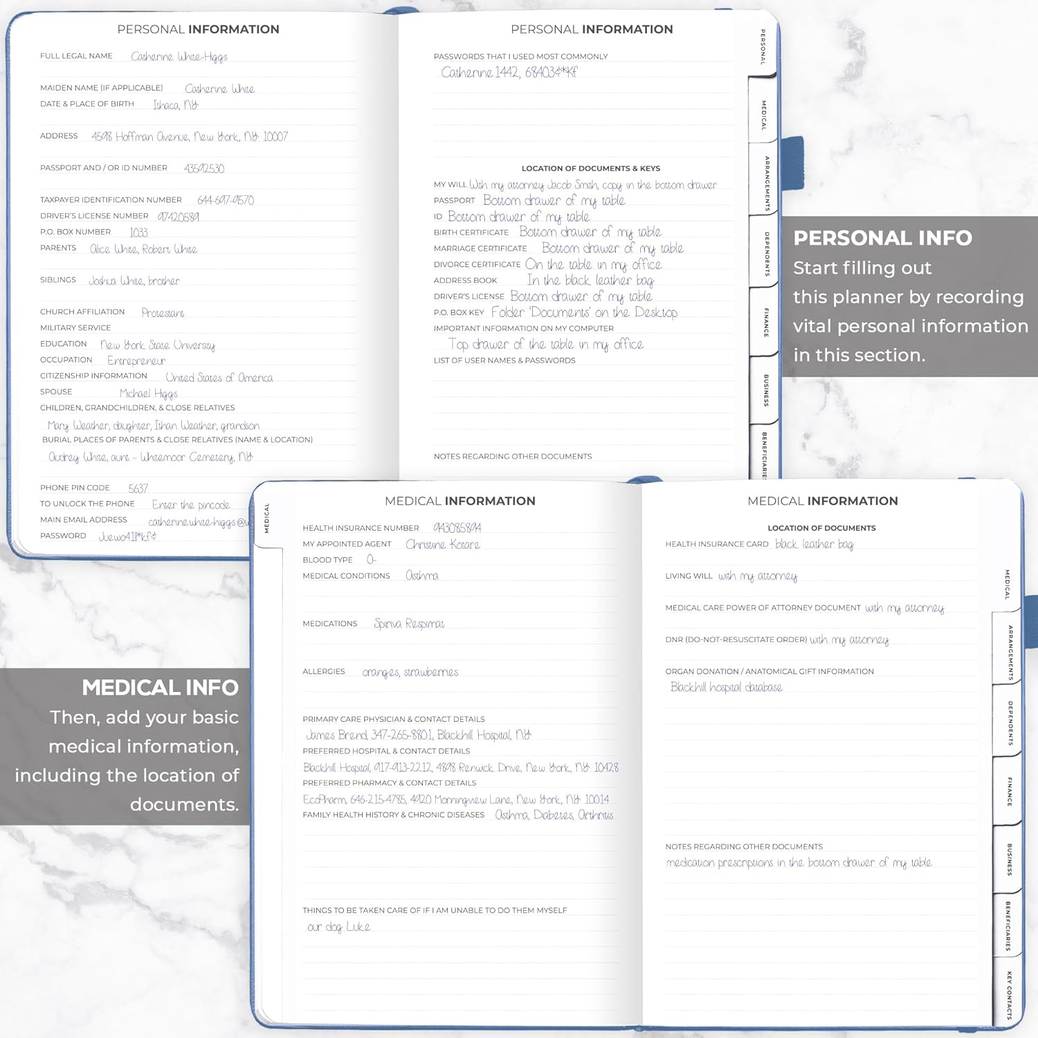 - MEDICAL & FINANCIAL INFO, INSURANCE POLICIES, ACTIVE MEMBERSHIPS & MORE: Inside this funeral planning workbook, you can add care instructions for dependents and pets, personal property, finance & business info, insurance policies, beneficiaries, and more.