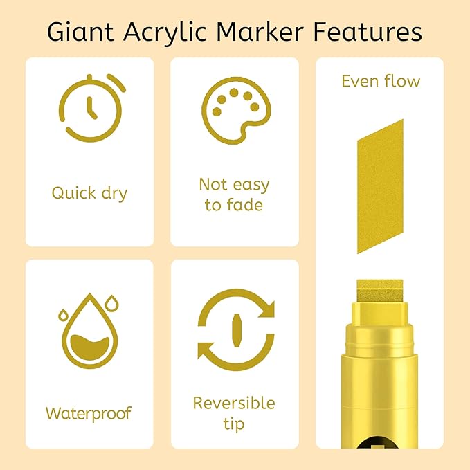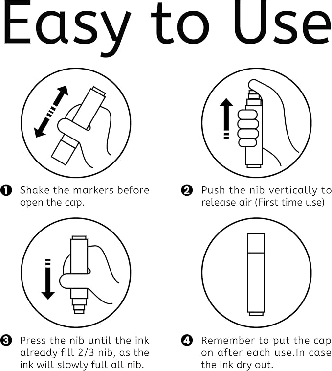 - Instruction: For the acrylic paint markers please shake the marker before use, and press the nib up and down or several times until jumbo marker tip fills with ink(first time use). Please cover the cap after use, in case the Ink dries out.