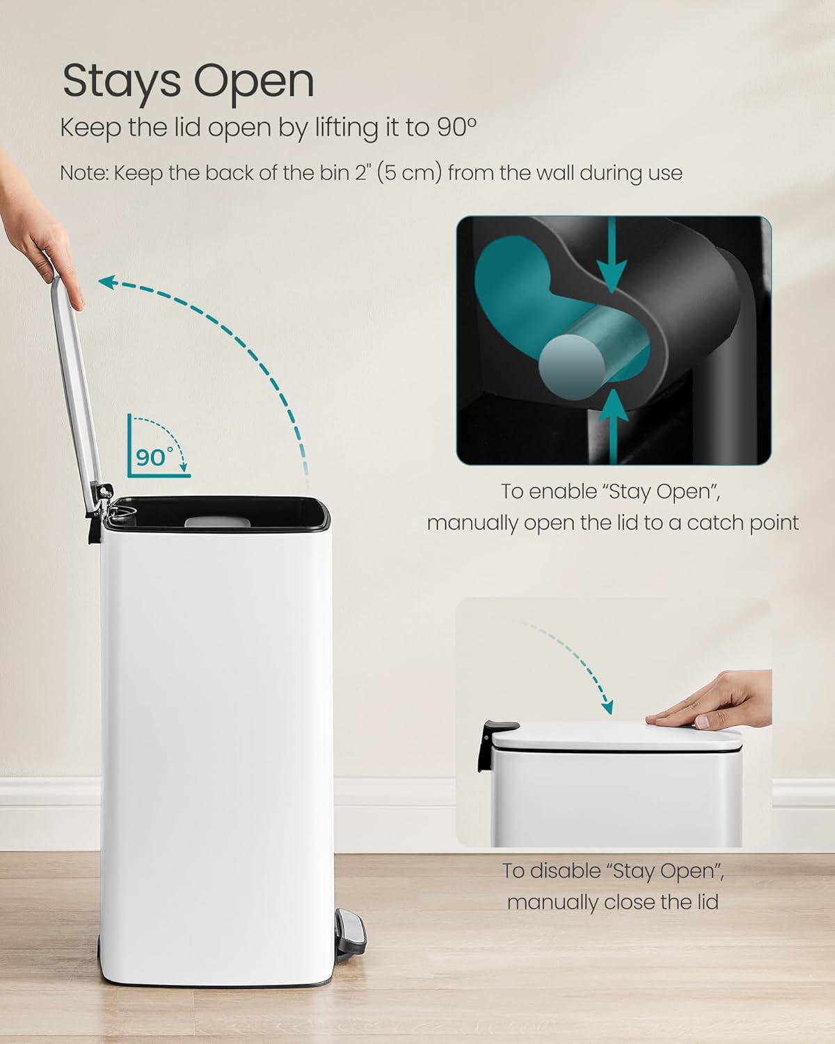 - γSOFT-CLOSE & STAY-OPENγThis garbage can features a lid that closes quietly and gently without slamming shut. Additionally, you can keep the lid open by manually open it to 90Β° for easy waste disposal when needed