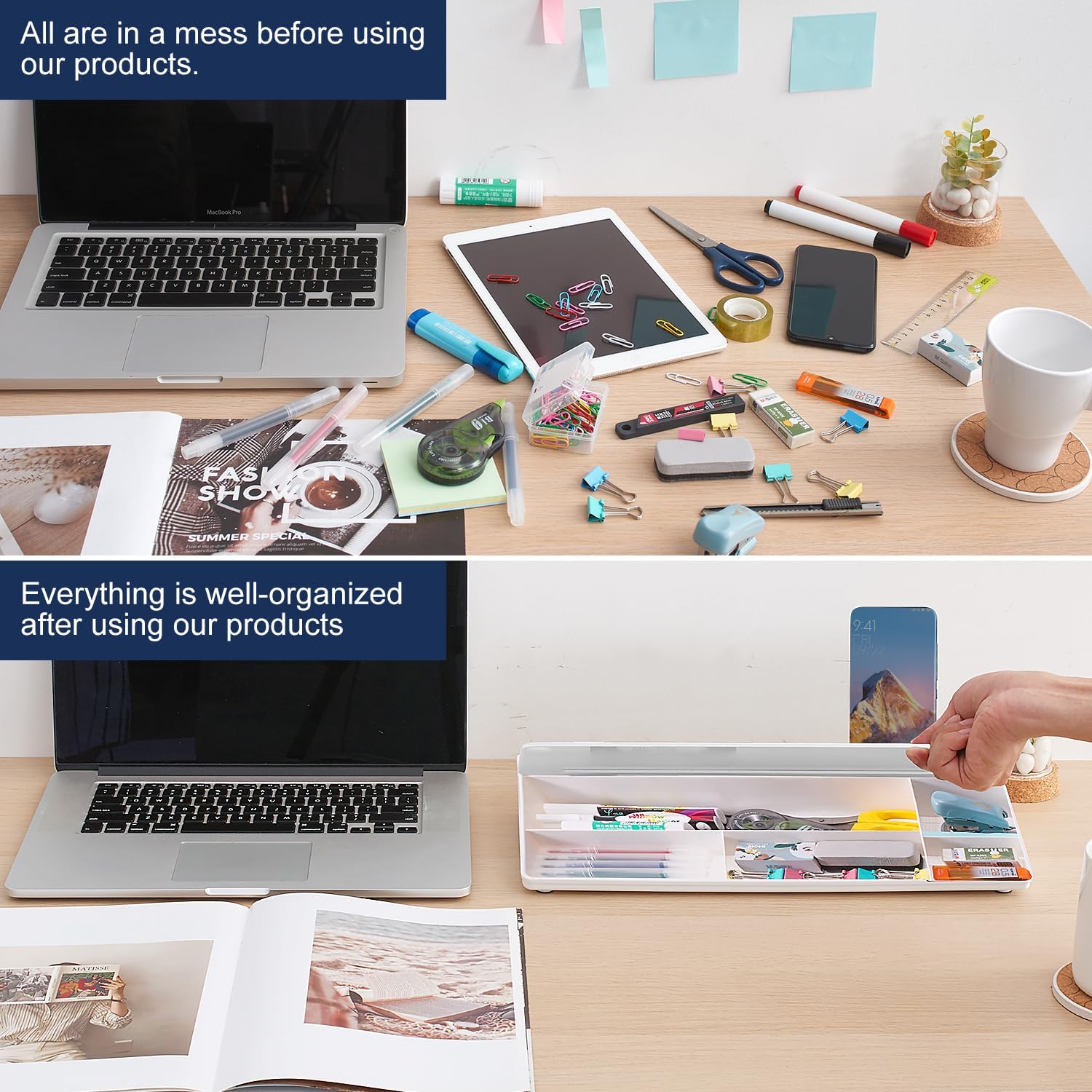 - HIDDEN STORAGE & MOBILE TRAY: De-clutter your desk by storing markers, magnetic eraser and other desktop accessories in the opening drawer or place markers on the accessory tray for quick access. And one more long tray on the top of the dry erase white board for your pad or mobile.