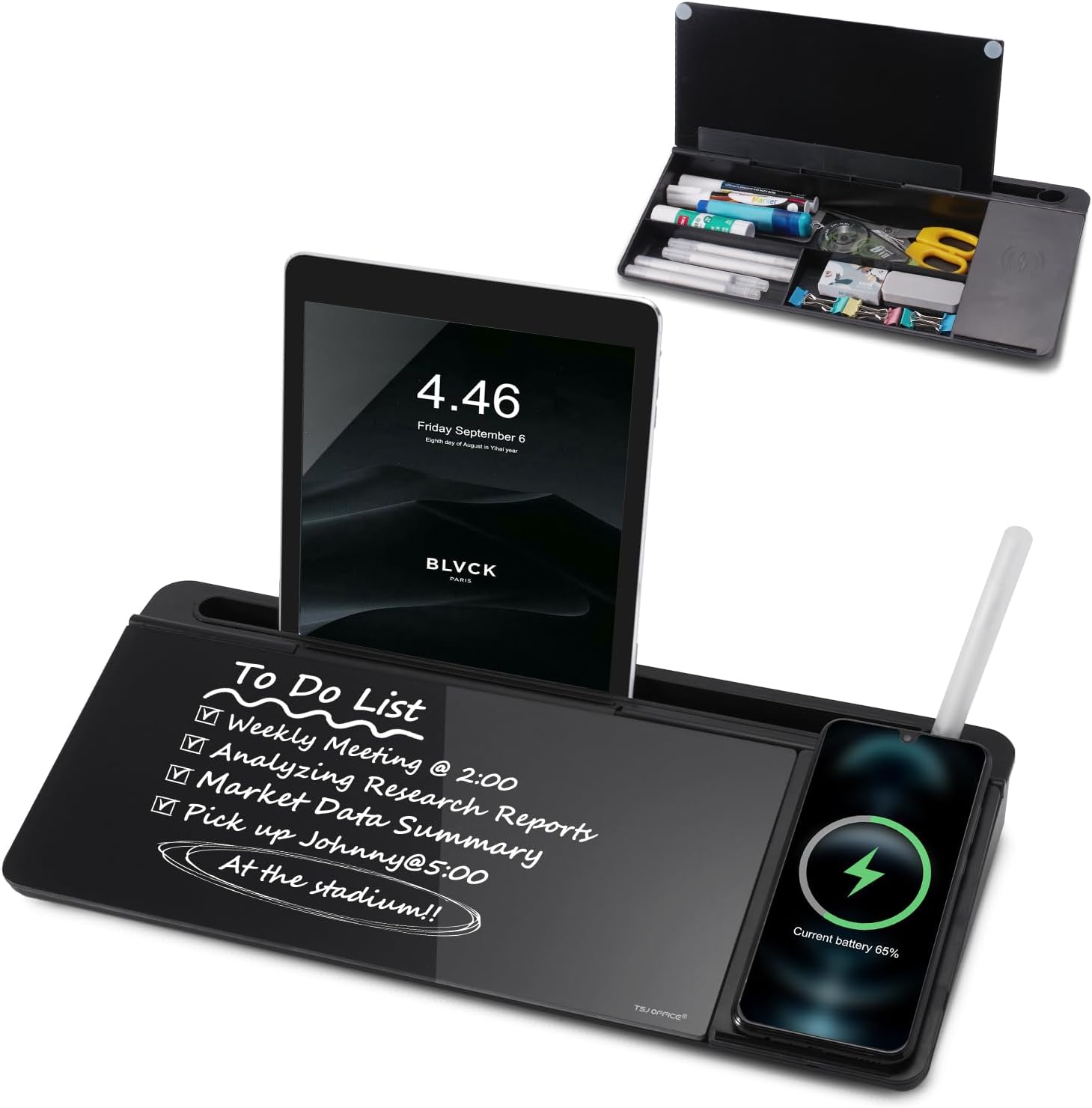 - Wireless Charge Base: TSJ OFFICE desk glass white board with wireless charger stand makes it very convenient to charge your compatible devices safety without additional cables or adapters. With 5ft Type-C Cable complies with part 15 of the FCC Rules.