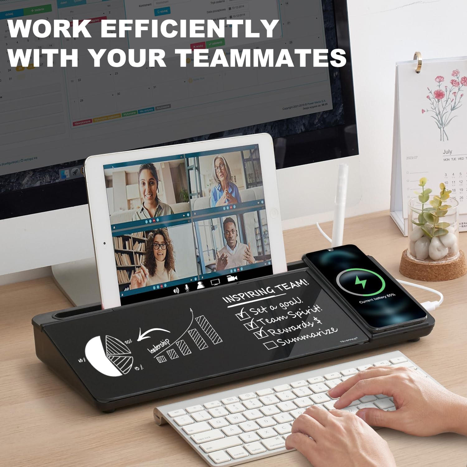 - PERFECT DESIGN: Maximize your work area. The desktop whiteboard is designed to sit perfectly between a keyboard and monitor and is slope angled for comfortable reading and writing, or typing when you are using it as a keyboard stand.