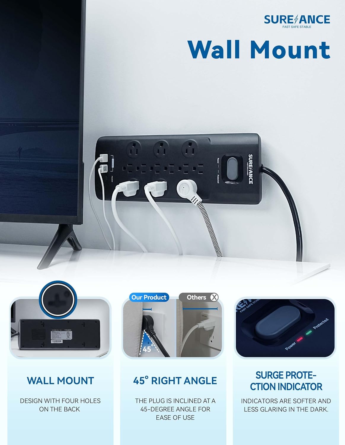 - 【Mountable and Flat Plug】This power strip includes four mounting holes on the back for easy installation and a slim flat plug that fits snugly in tight spaces. Made from fire-resistant material, it measures L12.99” x W4.73” x H1.05”. The 45-degree angled plug provides convenient access and ease of use. It is suitable for various settings, including bathrooms, kitchens, offices, workshops, gaming rooms, dormitories, classrooms, hospitals, hotels, living rooms, and restaurants.