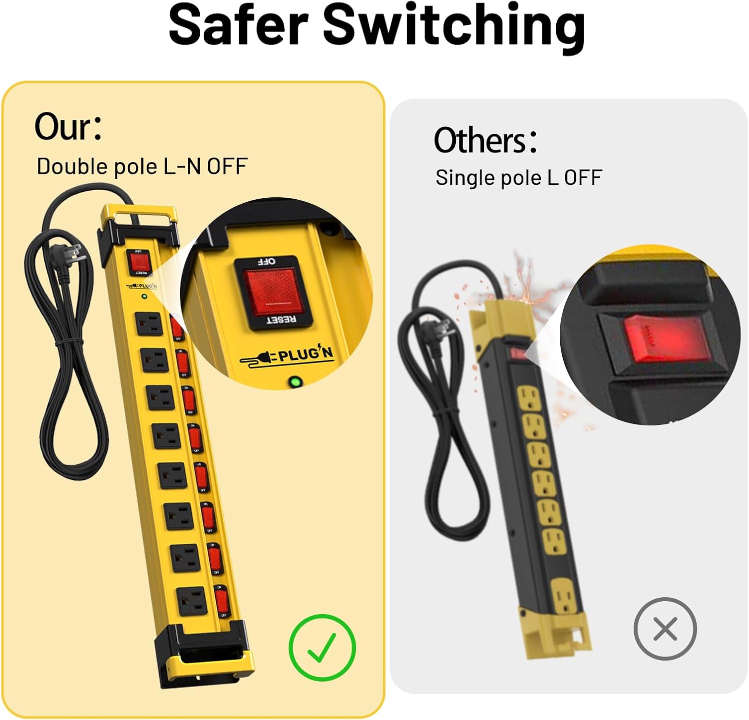 Plug'n 8 Outlet Long Power Strip,2700J Surge Protector with Individual Switches,Wide Spaced,Heavy Duty Power Strip with 6FT/14AWG/15A Power Cord and Flat Plug for Workshop,Garage,Industrial,Home