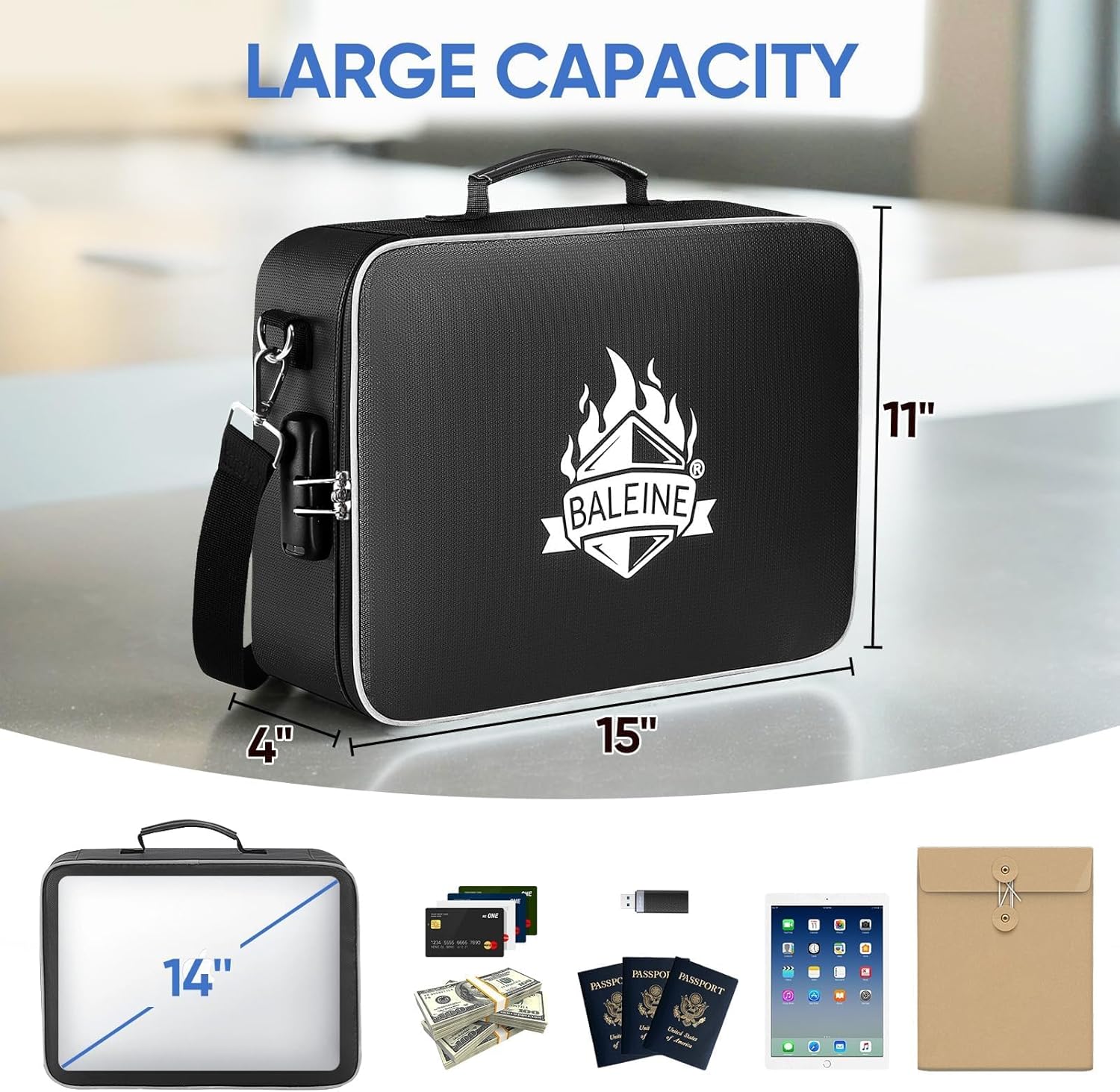 BALEINE Fireproof Document Box with Lock, Portable Fireproof Document Bag Waterproof Fire Proof File Boxes for Documents, File Organizer Box for Important Paperwork (Black, 15''x11''x4'')