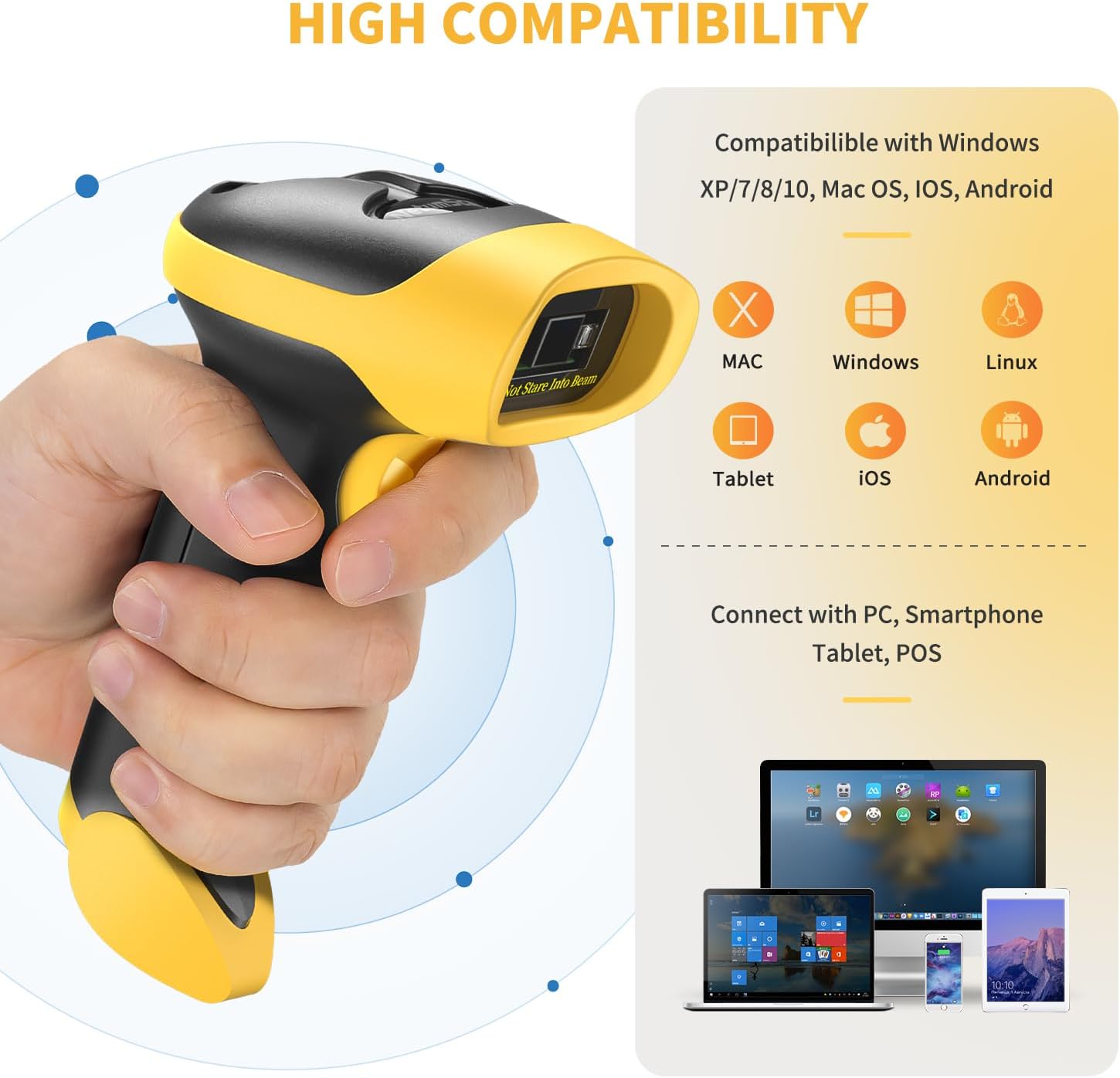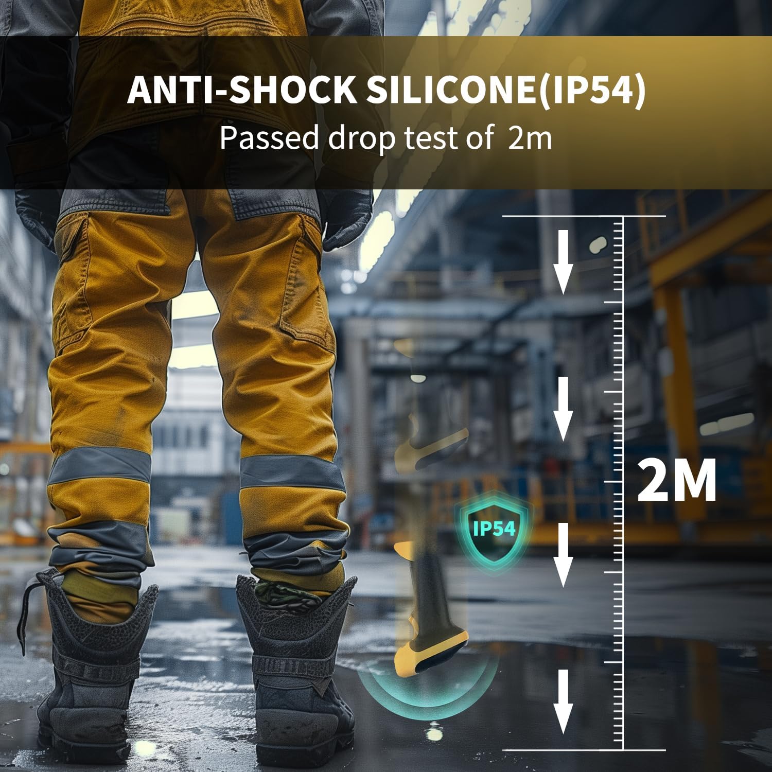 - ➤Professional Anti-Shock Design - Made of great ABS+PC materials,high shock-resistant, and the silicone protective cover can avoid the scratches and friction while falling from the height of 6.57 feet; the technical of IP54 sturdy which protect the wireless barcode scanner from dust and moisture.