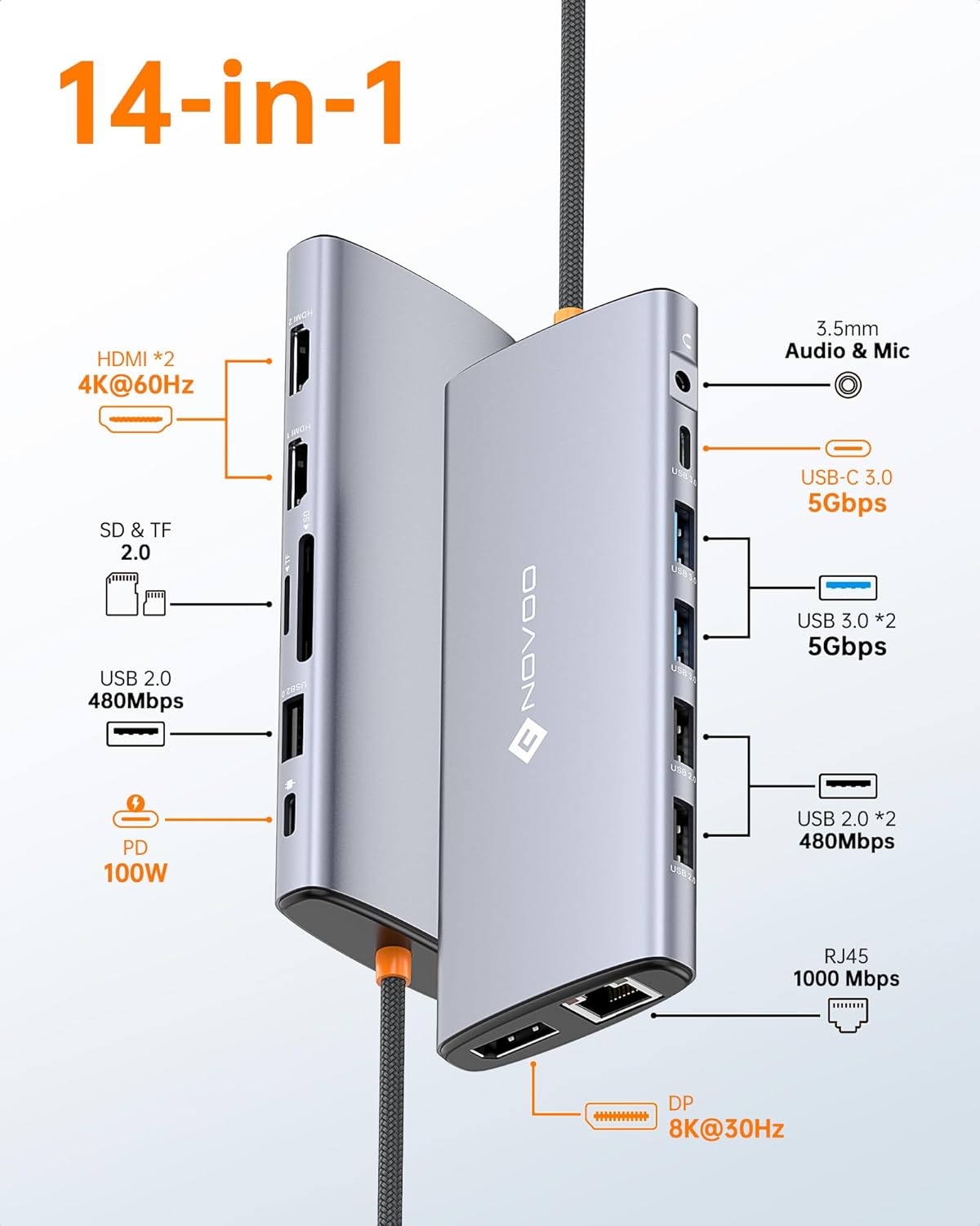 - πγ14-in-1 USB C Docking StationγNOVOO USB C HDMI multiport hub equipped with 1*DP port, dual 4K HDMI ports, 2*USB A 3.0 ports, 1*Gigabit RJ45 port, 1*USB C PD100W charging port, 1*USB C data transfer port (speeds up to 5Gbps) and 3*USB 2.0 ports, SD/Micro SD card reader and 3.5mm microphone/audio port. Plug and play, no need to install any drivers or software.