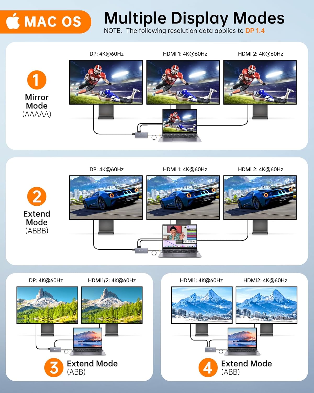 - πγPerfect visual enjoymentγThe DP single port of the USB C Hub supports up to 8K@30Hz/4K@120Hz, and the dual HDMI can directly transmit 4K@60Hz video to an HDTV, monitor or projector. With this USB C Dock, you can enjoy an ultra-HD movie experience and 3D visuals, and achieve ultra-smooth video gaming.πΈFinal resolution depends on your device and connection, please check product guides and documentation or confirm with us.
