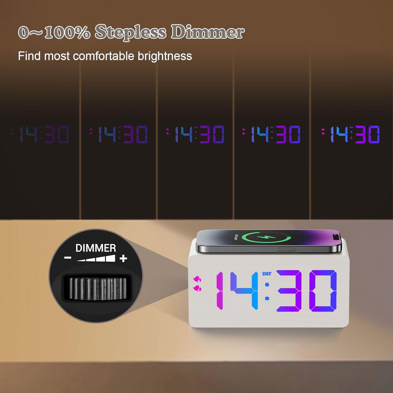 - Special Feature : Large Time Display with Bold Numbers, 0~100% Stepless Dimmer, 10W Fast Wireless Charging, 8 RGB Colors Display, Stylish Wood Grain Surface, Dual USB Charging Ports, Dual Alarm Clock, Snooze Button, Manual DST, etc. Large Time Display with Bold Numbers, 0~100% Stepless Dimmer, 10W Fast Wireless Charging, 8 RGB Colors Display, Stylish Wood Grain Surface, Dual USB Charging Ports, Dual⦠See more