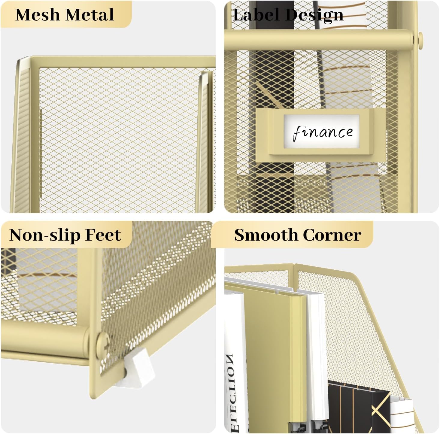 SUPEASY Desk Organizers Metal Desk Magazine File Holder with 5 Vertical Compartments Rack File Organizer for Office Desktop, Home Workspace, Golden Yellow, Plus