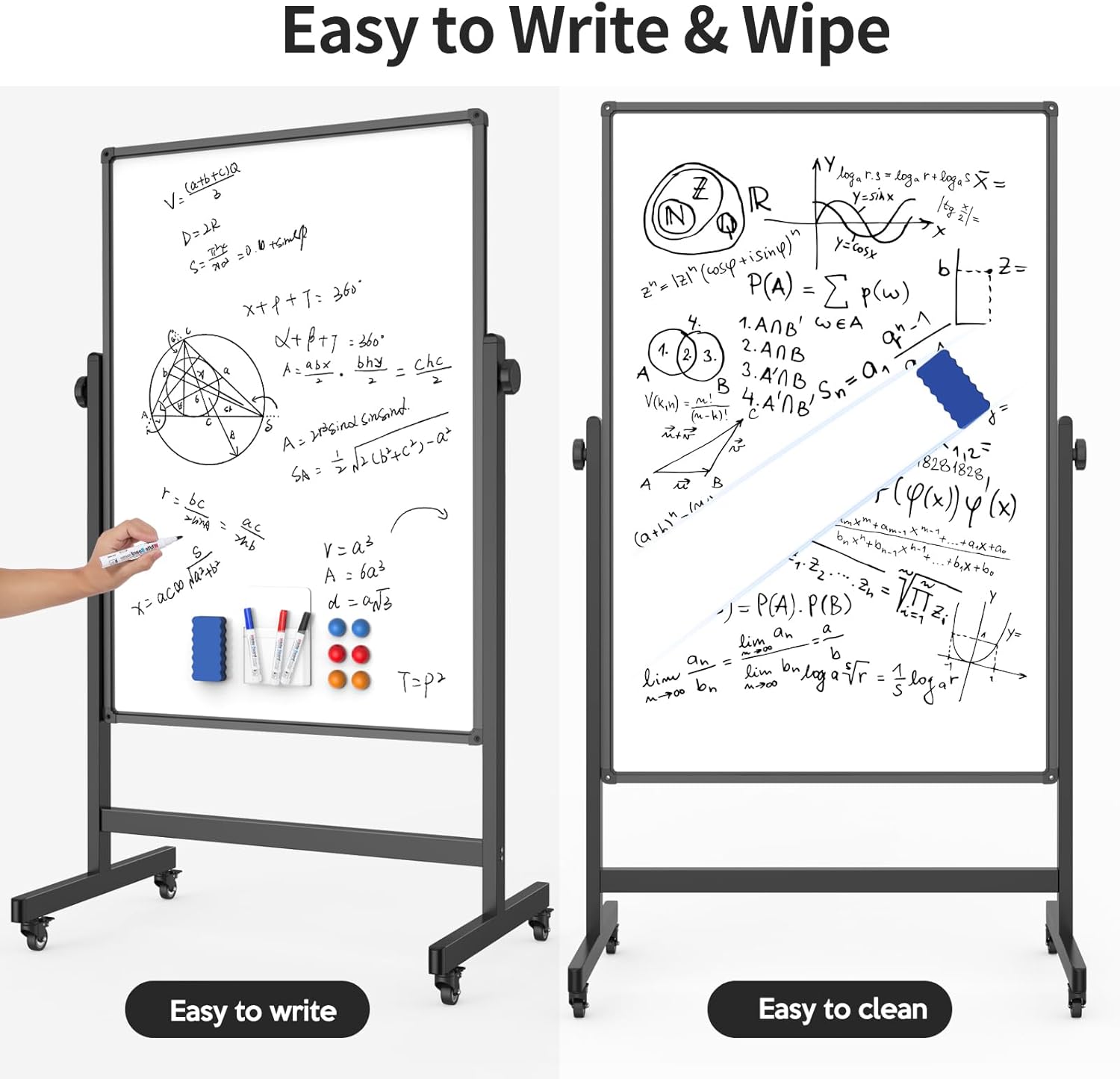 - Spacious Writing Surface with Complete Accessories: Maximize your writing space with our double-sided 48x32-inch whiteboard, offering double the surface area with a quick flip. Includes 3 markers, 6 clasps, 1 eraser board, and a pen holder—everything you need to get started.