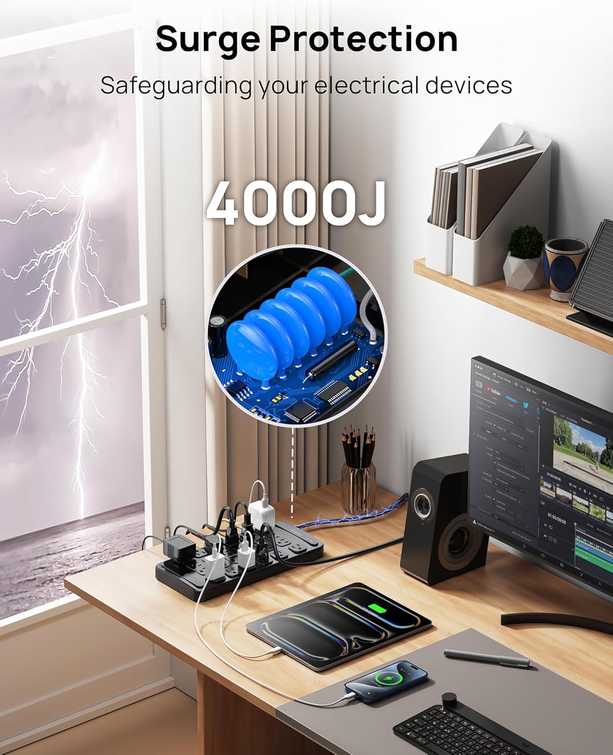 - 4000 Joules Surge Protection: Safeguard your valuable electronics with 4000 Joules of advanced surge protection. This power strip shields your devices from unexpected voltage spikes, extending their lifespan and preventing potential damage. An easy-to-use on/off switch allows for quick resets and added safety