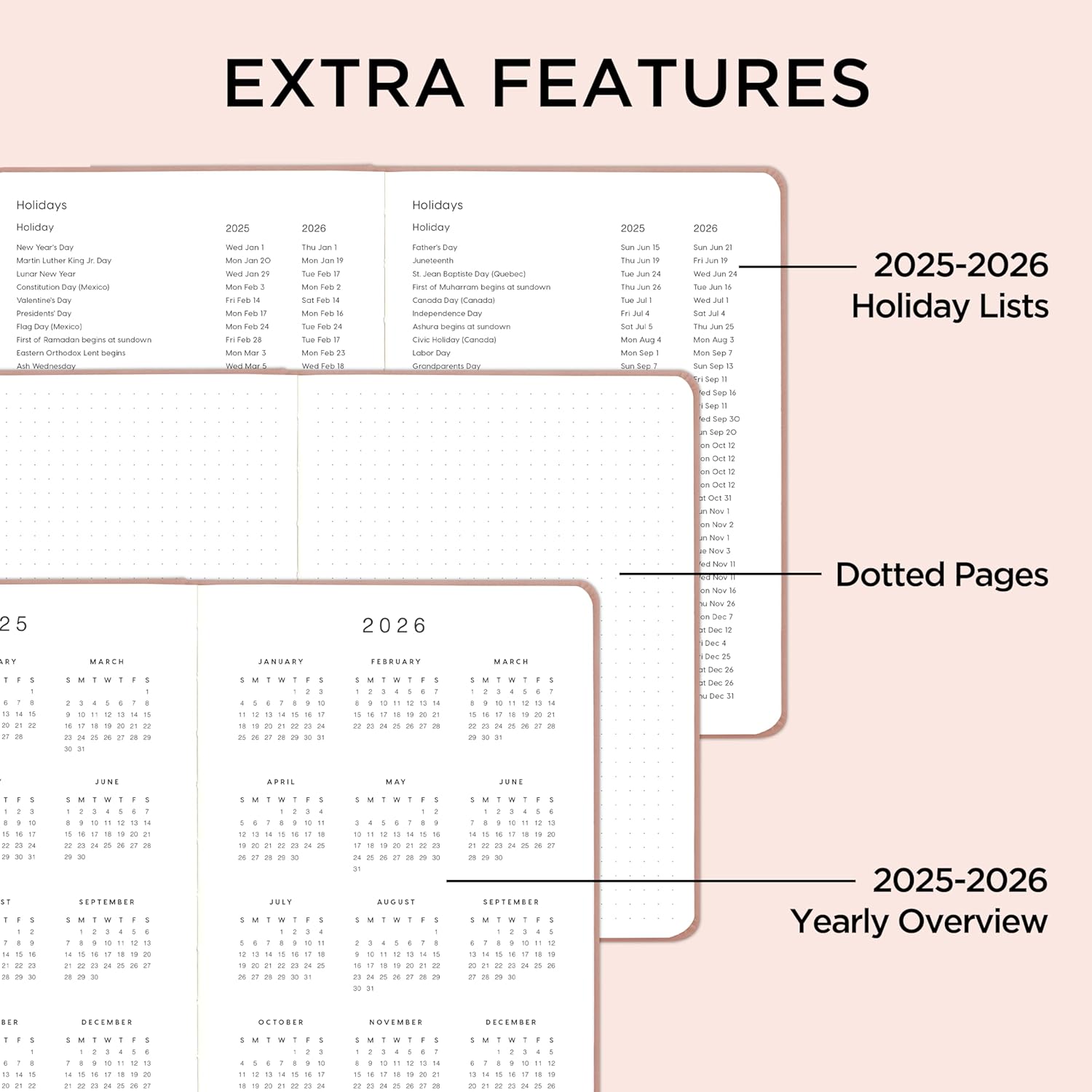- 【EXTRA FEATURES】The planner includes 2025-2026 calendars,2025-2026 holiday lists and extra 10 dotted pages to write down your thoughts. 12 PCS monthly tab stickers and 2 ribbon bookmarks for easy navigation and finding.